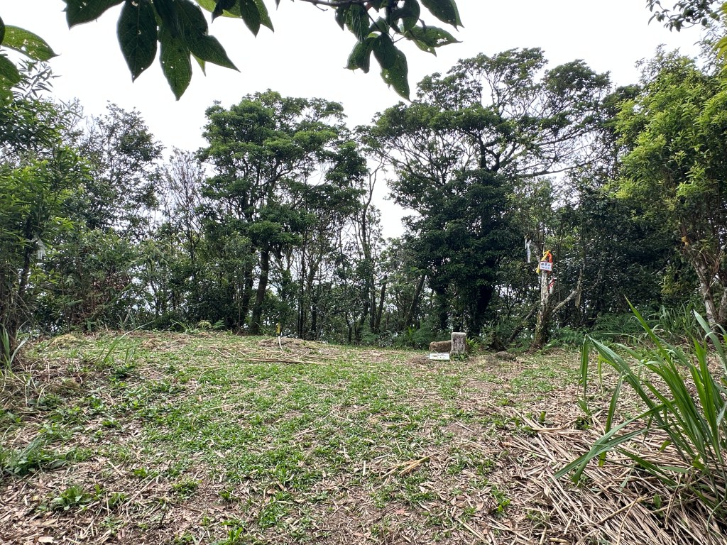 午餐後,接續先往白雞山走,路牌指標上寫著:白雞山87公尺,87?真的不能再多了!白雞山這裡的展望佳!拍完照後再回走回到白雞山岔。開始往右前緩下路徑走,接續陡上走了600公尺後來到雞罩山前峰,必須向左岔出陡上10公尺就可以看到三角點。陡下10公尺回到路徑上,繼續往前走100公尺經過竹林、稜線上的大岩石,通過後即可抵達平台山頭的雞罩山!