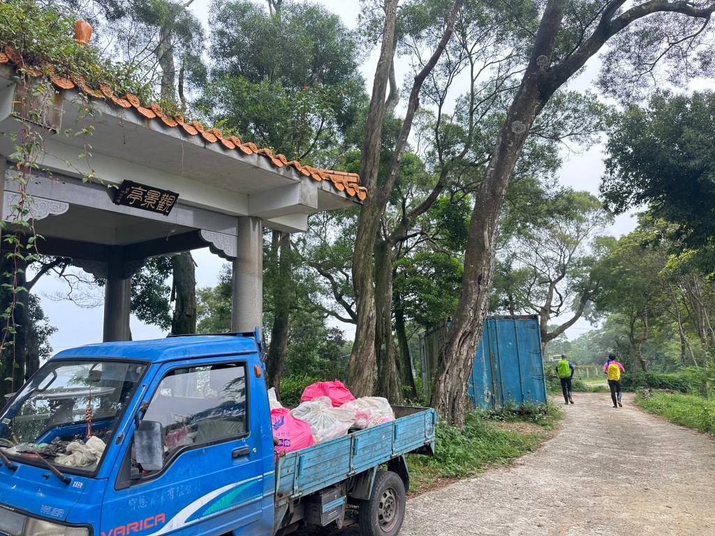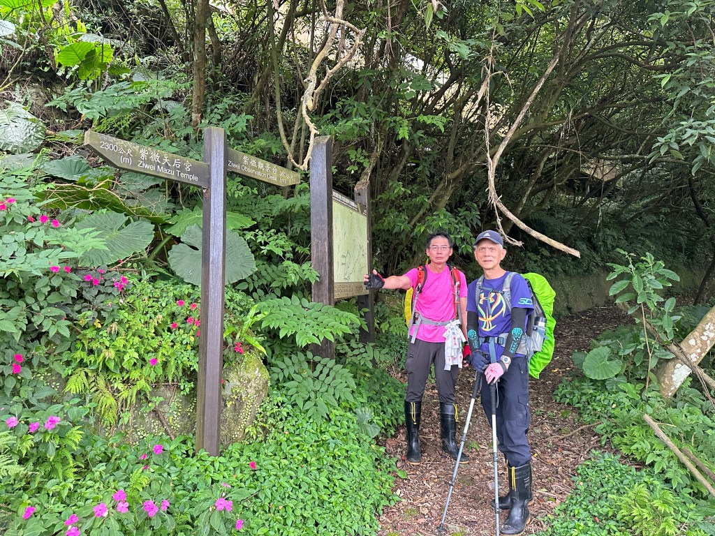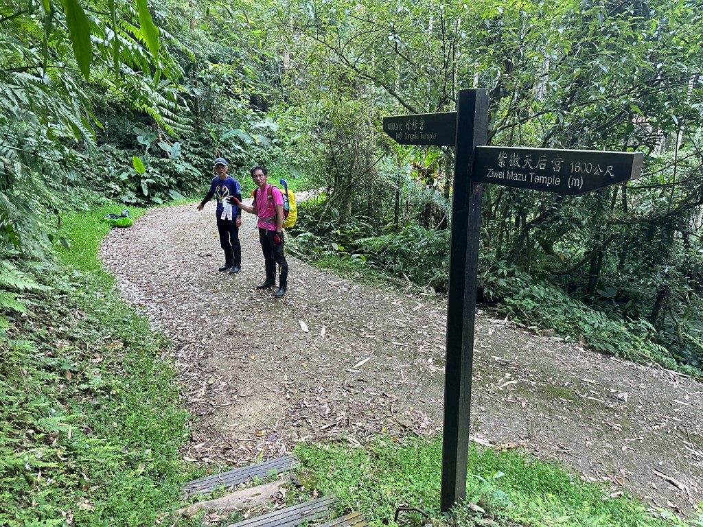 紫微森林這裡有賣餐點、冰熱飲,記得我們以前的行程也曾經走到這裡,也是在紫微森林買了冰可樂來止渴啊!由紫微森林前的停車場走進去,就可以看到通往六寮崙山的路牌指標。一路經過六寮崙山西南峰、六寮崙山,再一路沿著稜線路走450公尺陡下,遇岔路左轉繼續走約400公尺接上紫微南路,接續就沿著紫微南路陡下即看到紫微天后宮!