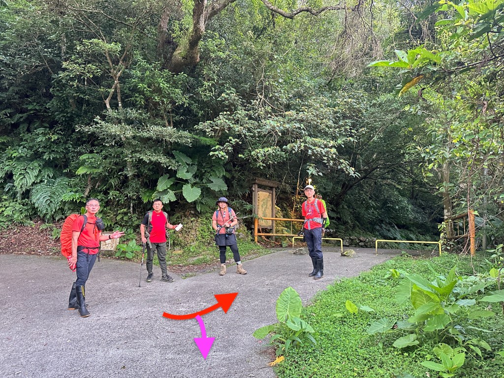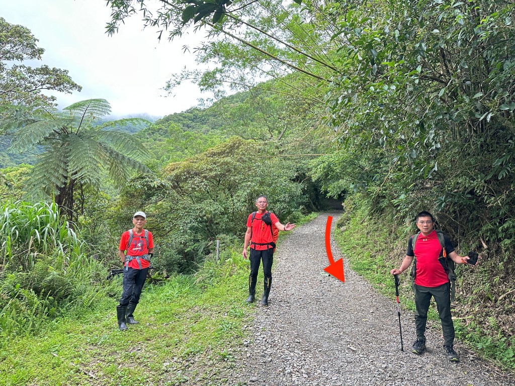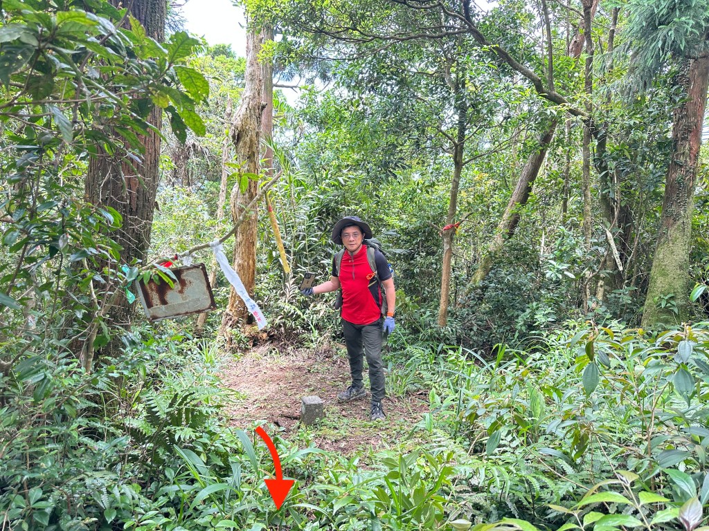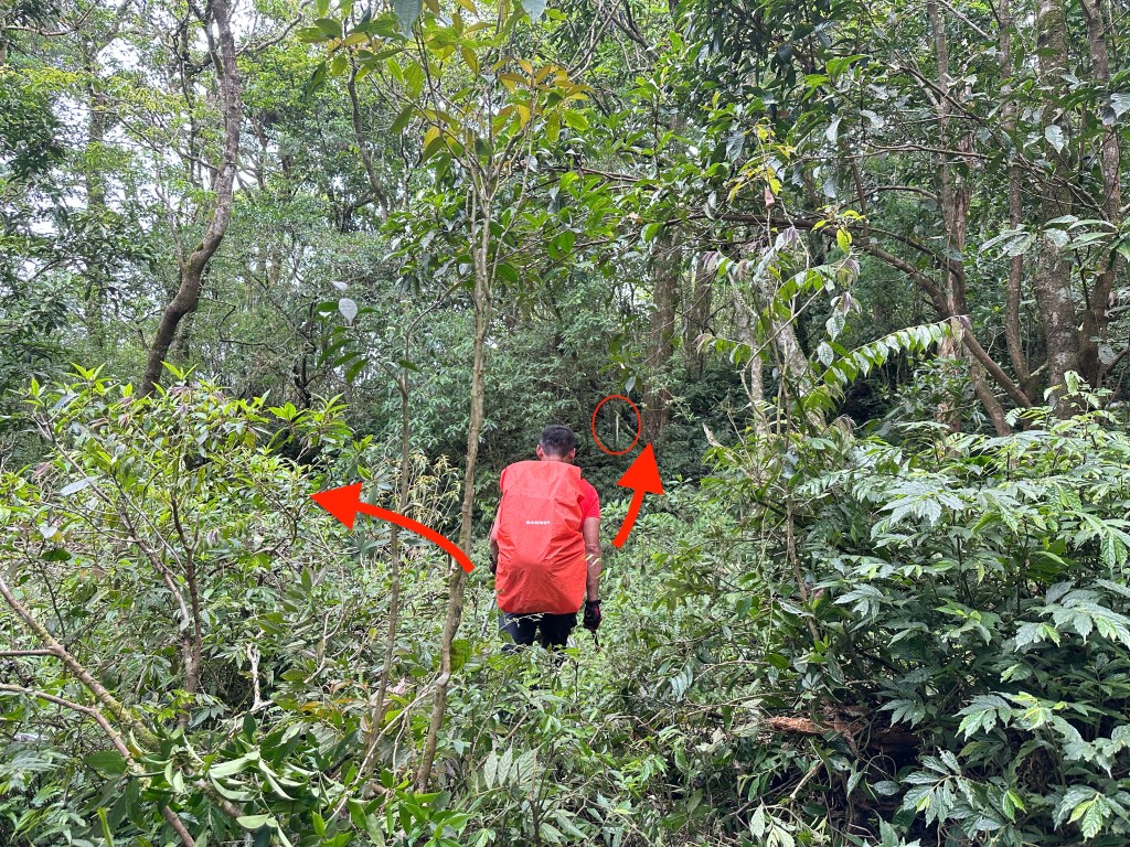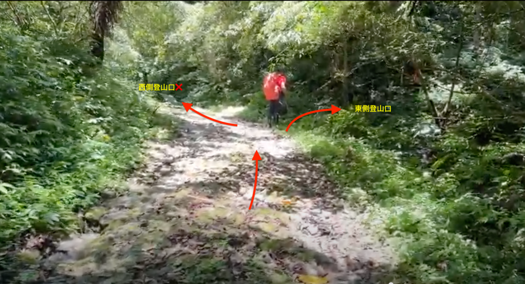 Smile堅持要由右側路線進入,因此由Allen陪同走此路線,我看著離線地圖上的軌跡,則想由左側路線直通!因此,我、Michael、Eva三人走左側登山口。兩處登山口在林道上差距有150m的距離,不遠。沒想到當我們三人走到左側登山口時,發現左側登山口已經完全回歸自然,入口的任何標示、布條都已然全不存在!