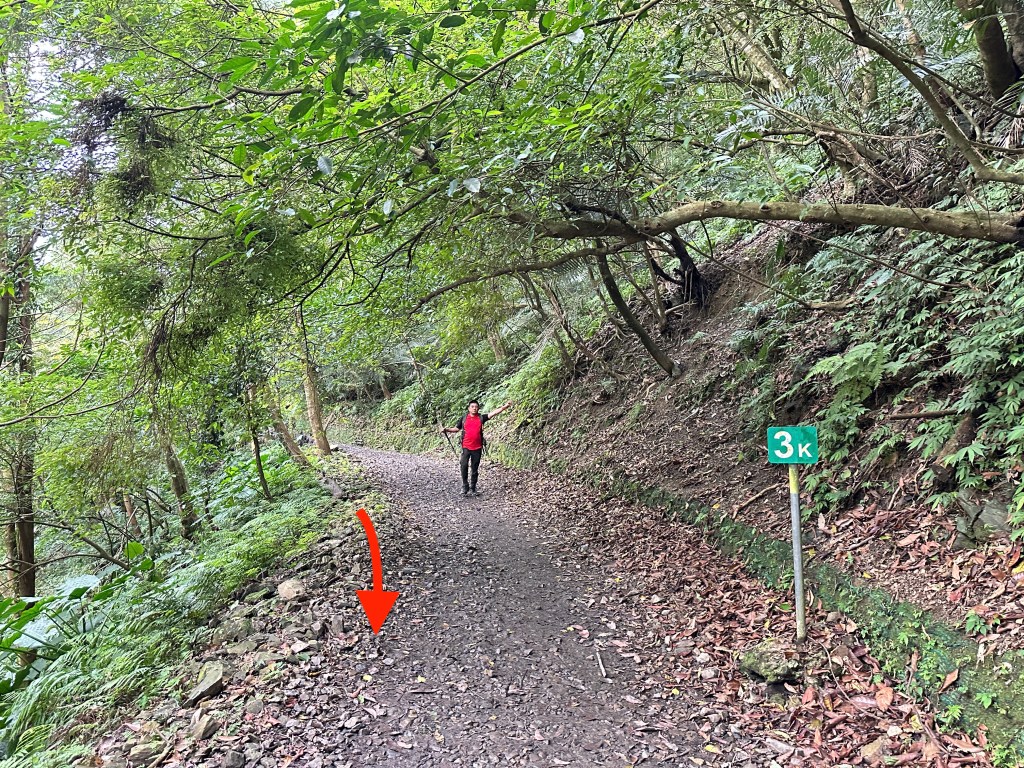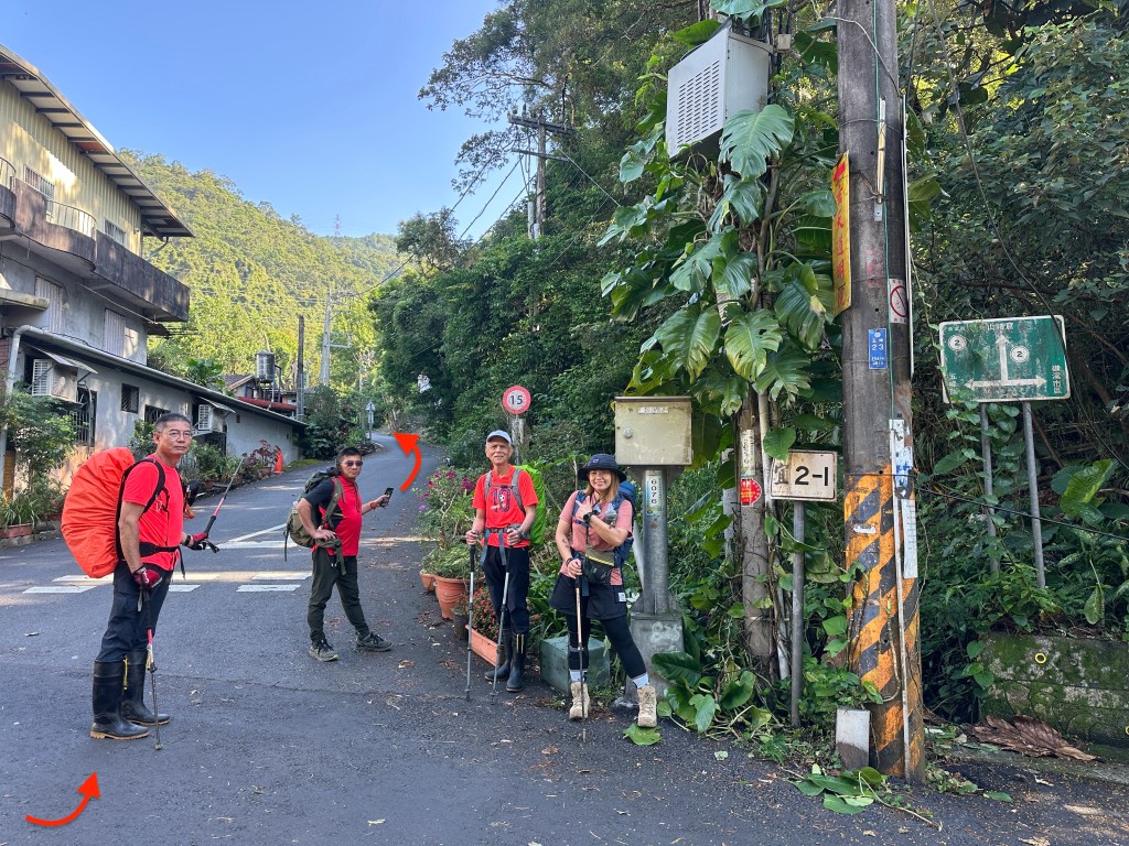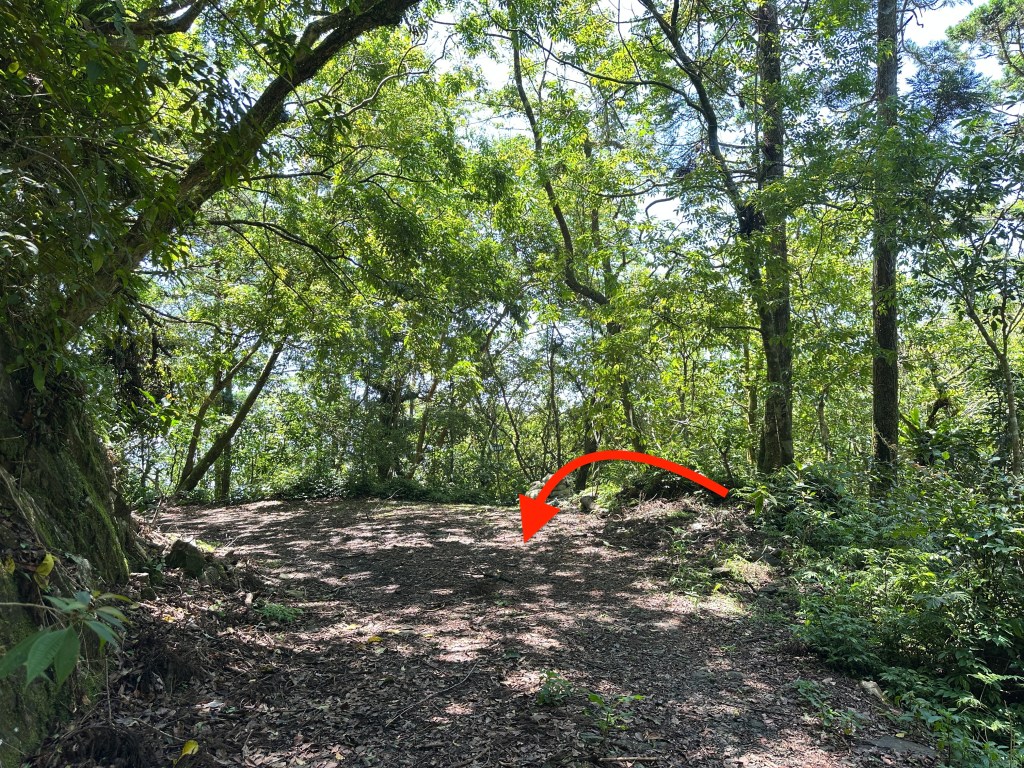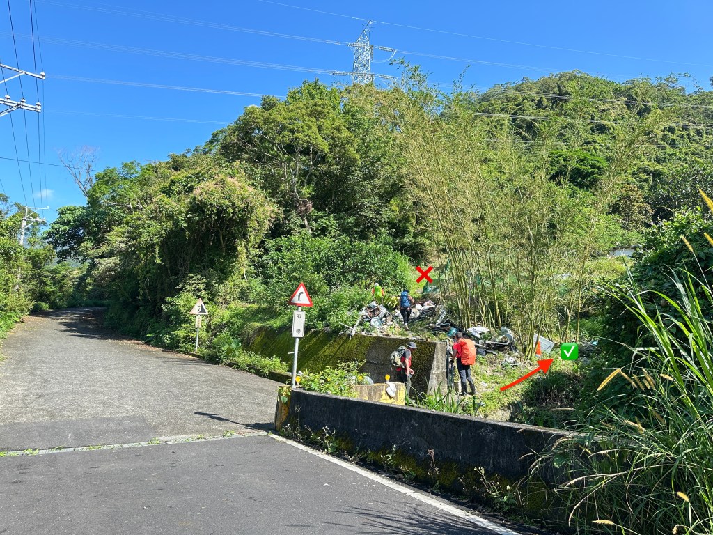 Smile堅持要由右側路線進入,因此由Allen陪同走此路線,我看著離線地圖上的軌跡,則想由左側路線直通!因此,我、Michael、Eva三人走左側登山口。兩處登山口在林道上差距有150m的距離,不遠。沒想到當我們三人走到左側登山口時,發現左側登山口已經完全回歸自然,入口的任何標示、布條都已然全不存在!