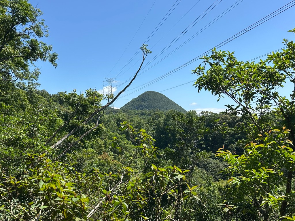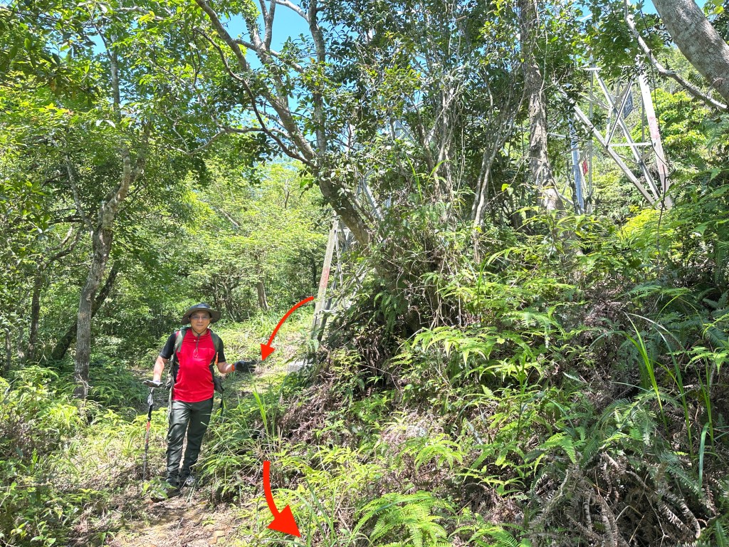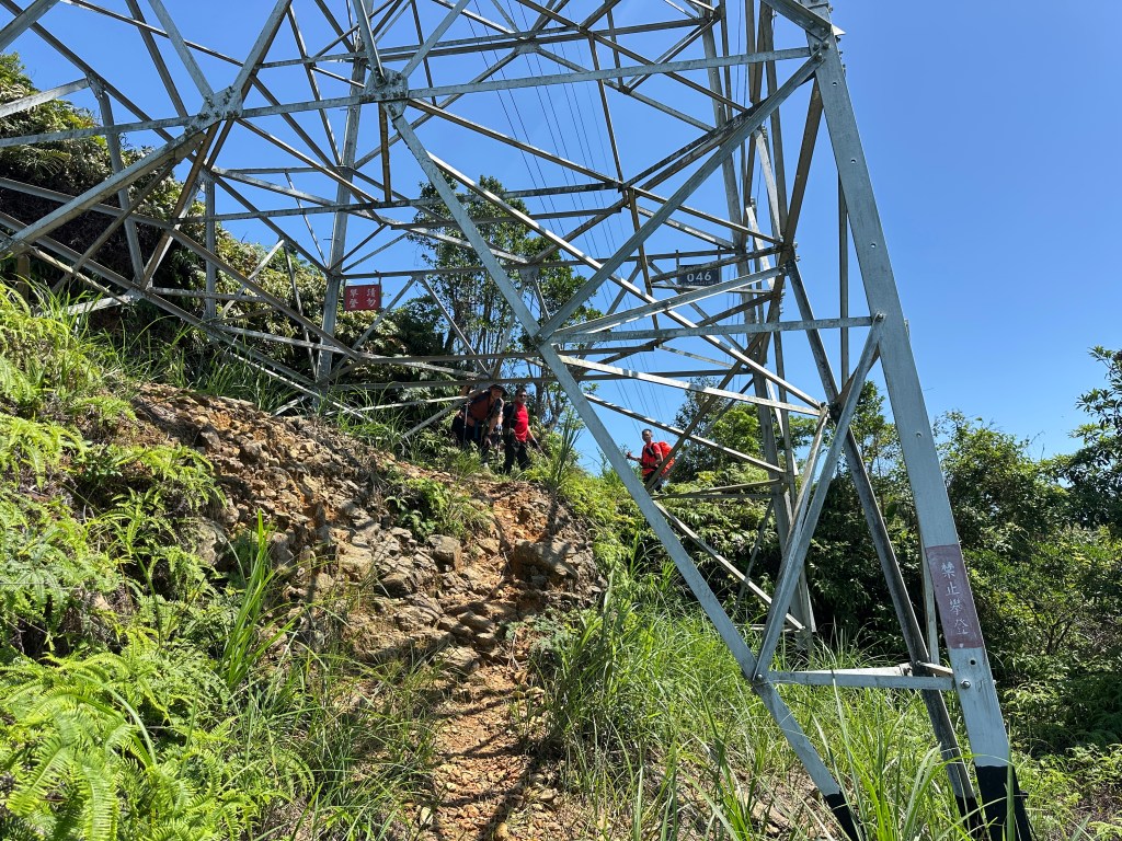 通過編號046電塔後,接下來的路徑都是非常好走的平緩邊坡路徑,經過一處乾淨小溪水源再經過編號045電塔,再往前走一段就接上寬大平緩林道。左轉由林道接往五峰旗山登山口,地圖上看有兩處可登入,其中右側路線離線地圖上只畫到H650m即停止?而左側路線卻可以直通往到離線地圖標示為H721的五峰旗山?