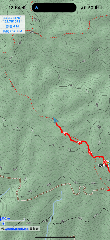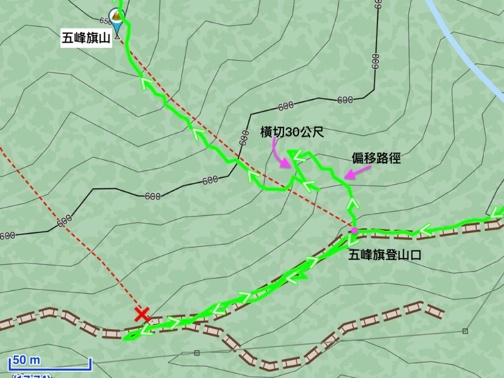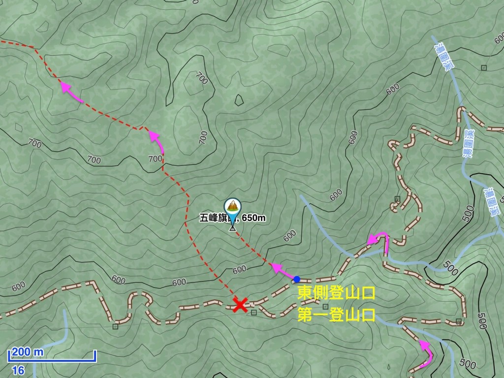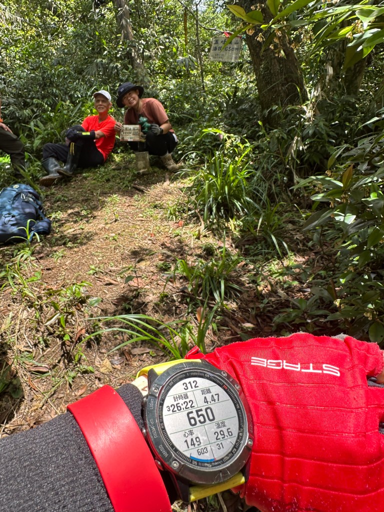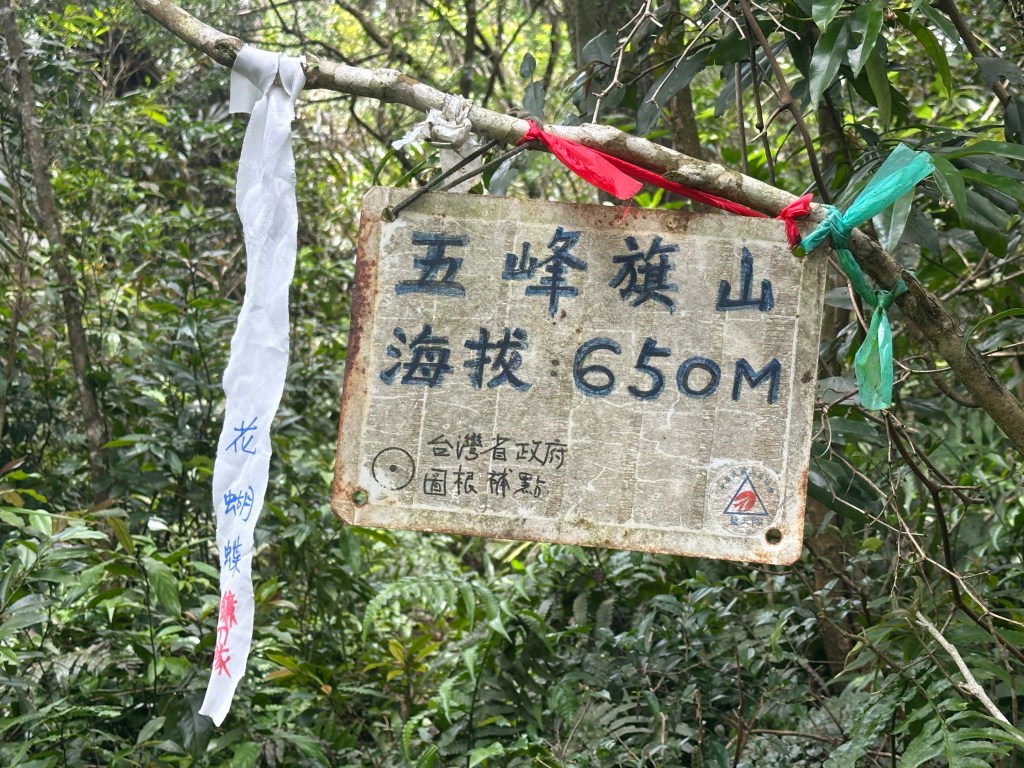 接上正規路線後,一路陡上到H650m的五峰旗山三角點!難怪右側軌跡線只畫到這裡為止?因為右側軌跡線的盡頭就是五峰旗山啊!這一段過程多花了不少時間!