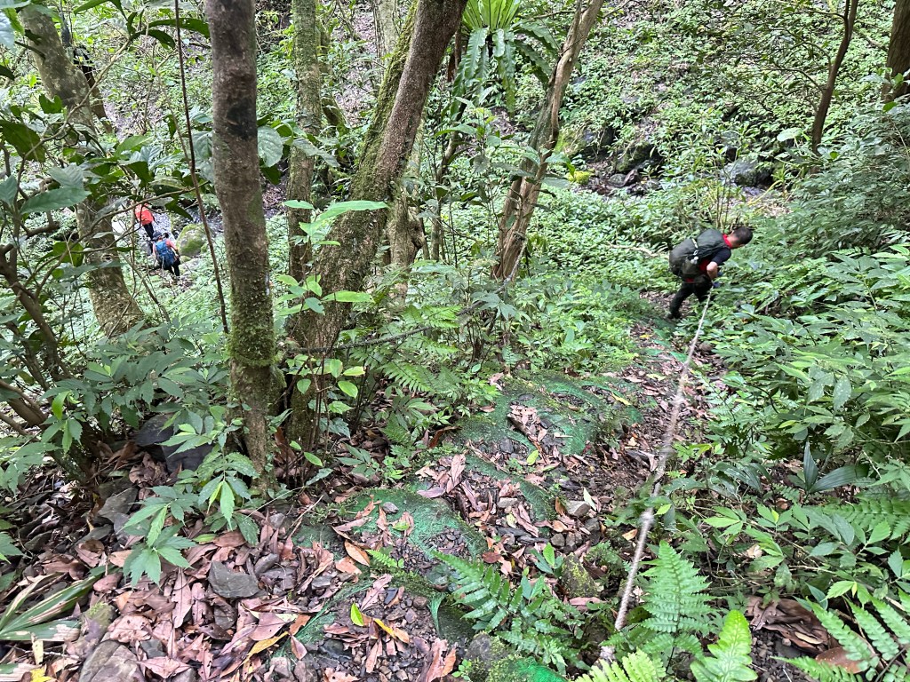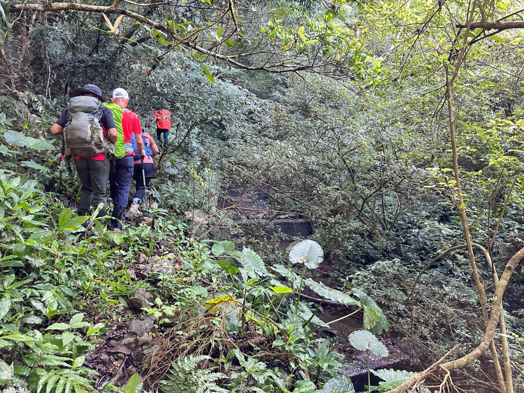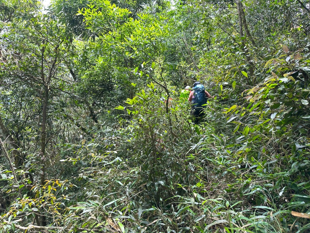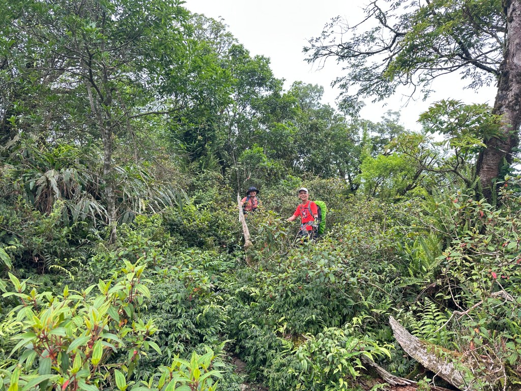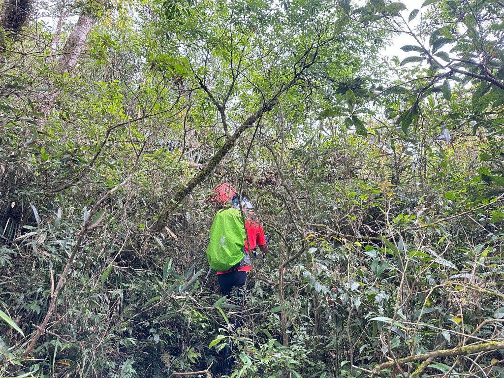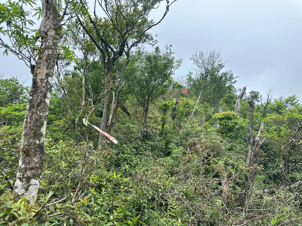 這一段路徑上走起來很掙扎,但今日我們的Allen一路在前方拿著鐮刀開路,我們則在後方一路綁上黃色及白色布條,近日來走應該路徑還很明顯,但可猜想只要再一兩個月無人通過想必植披定然過人,或許未來朋友們還可以看到我們綁得布條來前行。