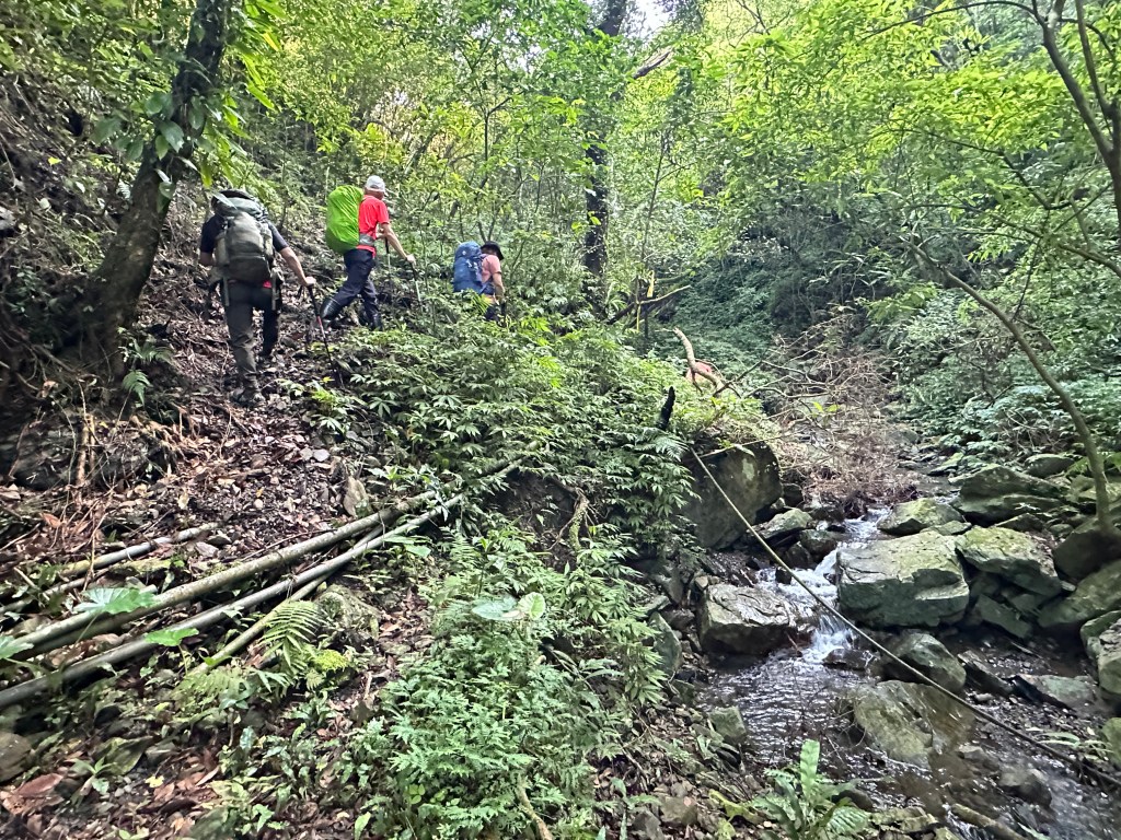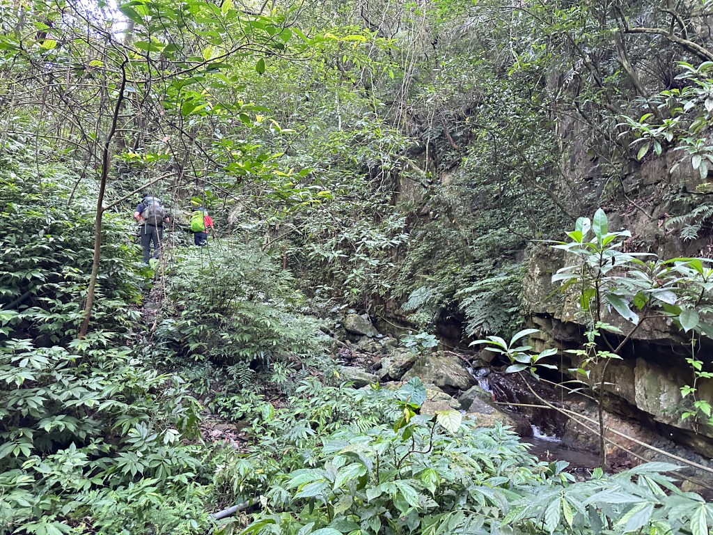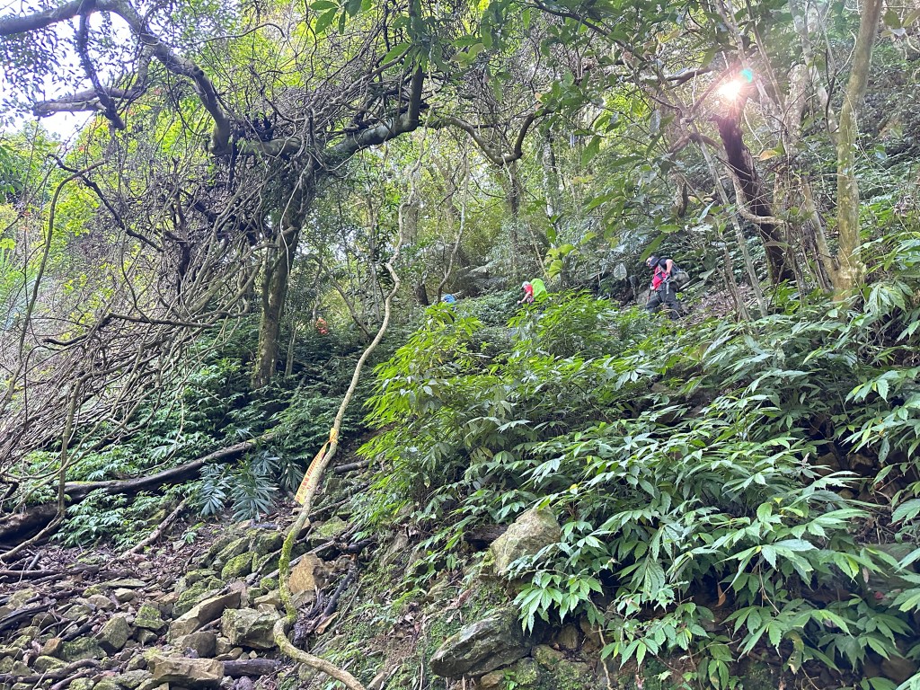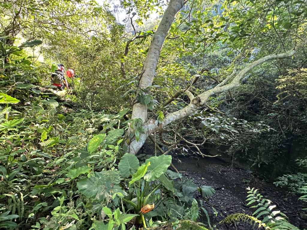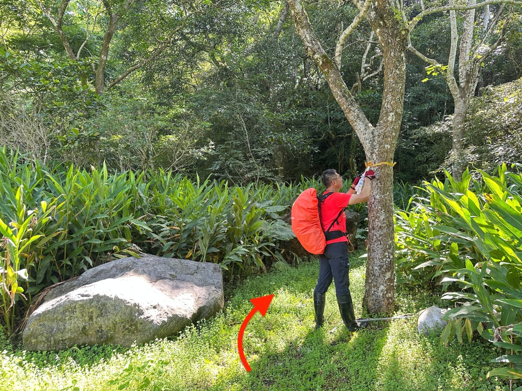 這一段路徑上走起來很掙扎,但今日我們的Allen一路在前方拿著鐮刀開路,我們則在後方一路綁上黃色及白色布條,近日來走應該路徑還很明顯,但可猜想只要再一兩個月無人通過想必植披定然過人,或許未來朋友們還可以看到我們綁得布條來前行。