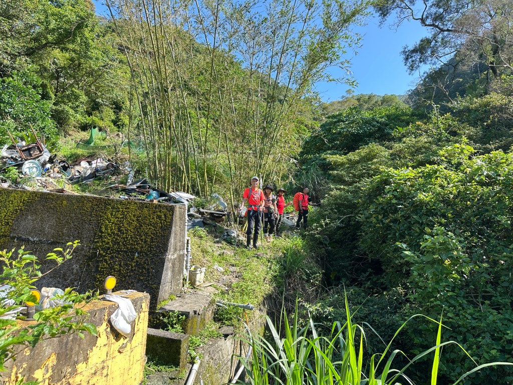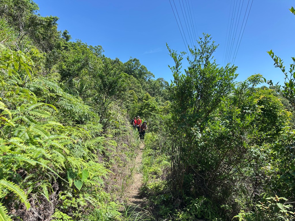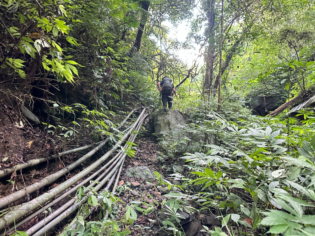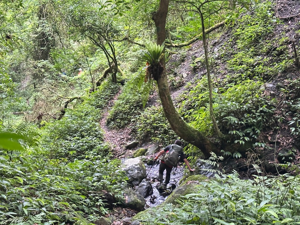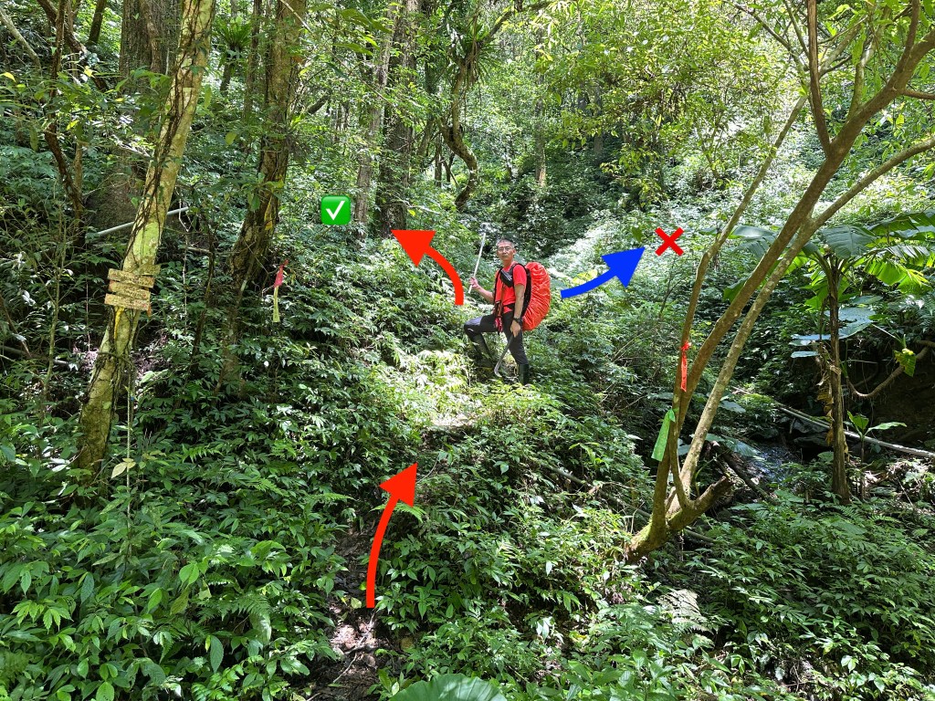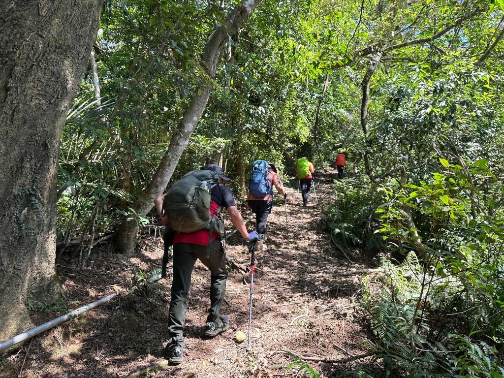 這一段路徑上走起來很掙扎,但今日我們的Allen一路在前方拿著鐮刀開路,我們則在後方一路綁上黃色及白色布條,近日來走應該路徑還很明顯,但可猜想只要再一兩個月無人通過想必植披定然過人,或許未來朋友們還可以看到我們綁得布條來前行。