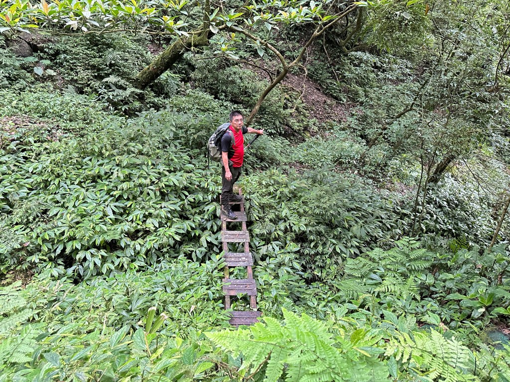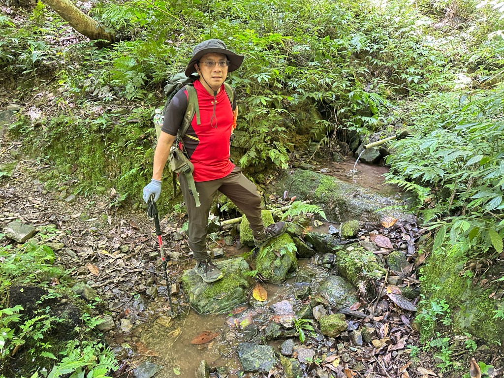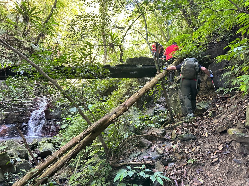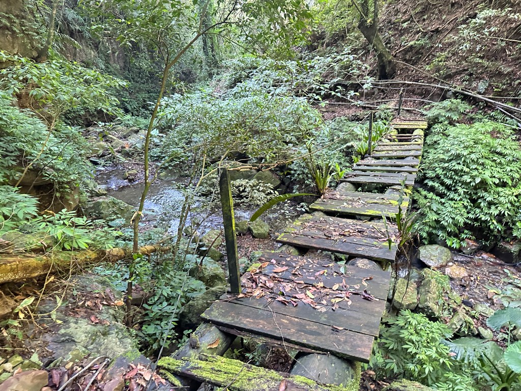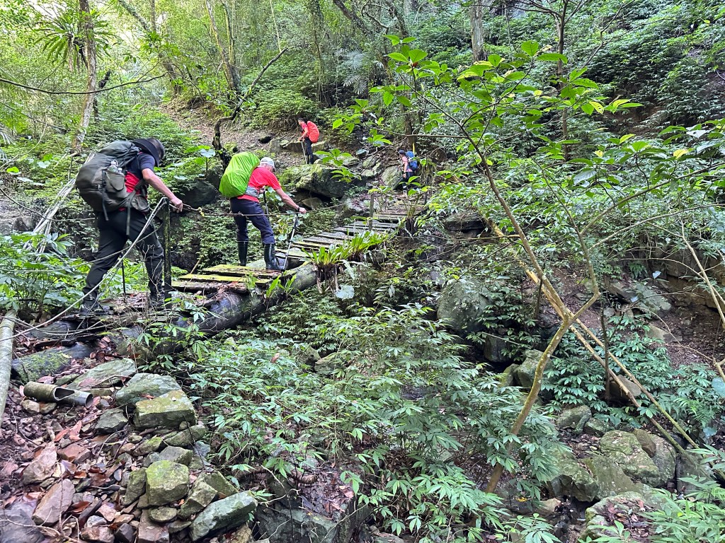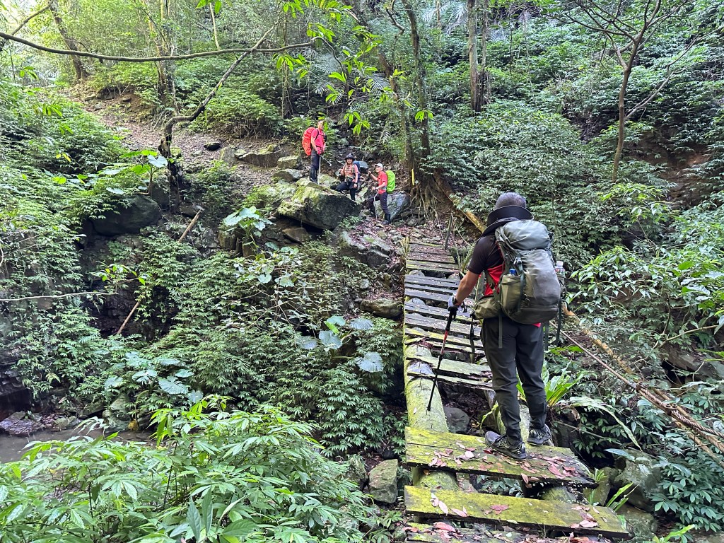 一行人三台車都停在五峰旗停車場,起登後由礁溪老爺酒店旁的五峰路70巷進入走200公尺,先經過小土地公廟再往前的右側就是登山口,登山口這裡有不少的垃圾,進入後不要往左側陡上走喔!要直直沿著小溪左岸狹小路徑一路陡上,難走!走0.7K脫離小溪,中途需過溪有一處殘破獨木橋,Allen、Michael、Eva三人驚心膽顫而過!我今天穿著跑鞋,每踩一步都滑,只好下溪過溪再陡上!
