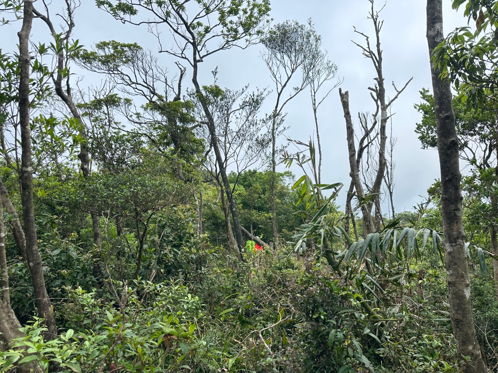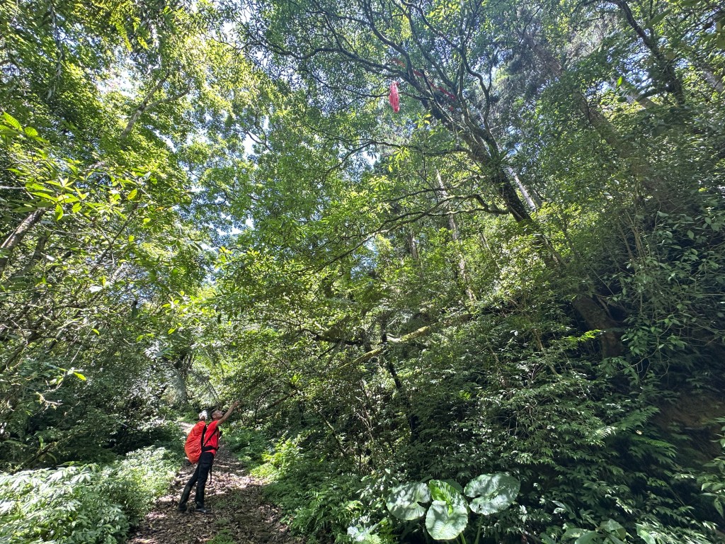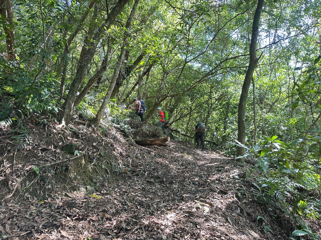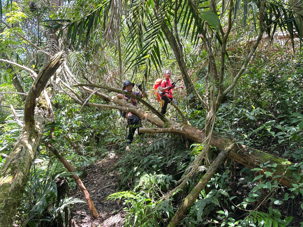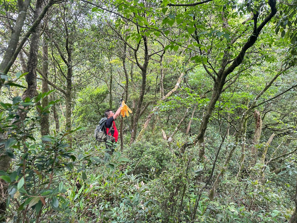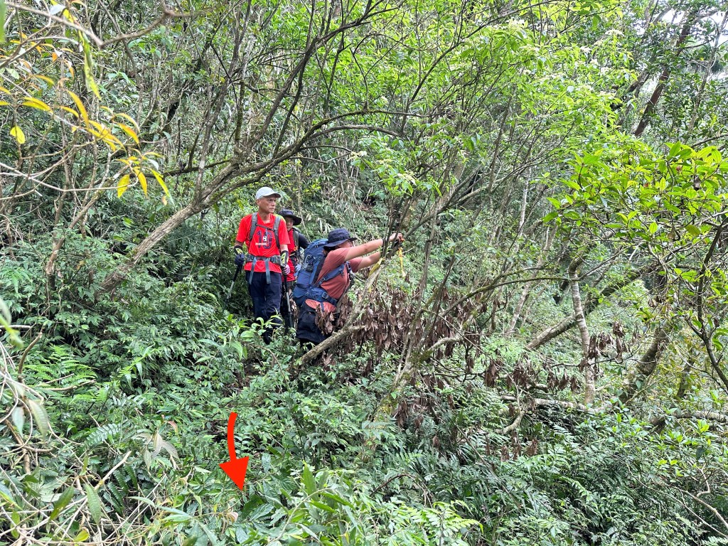 持續前行,由此在寬稜區發現有兩條路徑?右岔走稜線有看到幾條布條,且布條比較新!左岔走腰繞路看不到布條,但有路跡!Allen走在前走得比較快,已經在前方往左側腰繞路一路砍整,Smile與我走得比較慢,因一路綁上布條。因Allen、Eva、Michael已經都離我們快有100公尺,那就繼續走腰繞這一條路線吧!