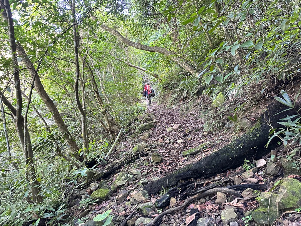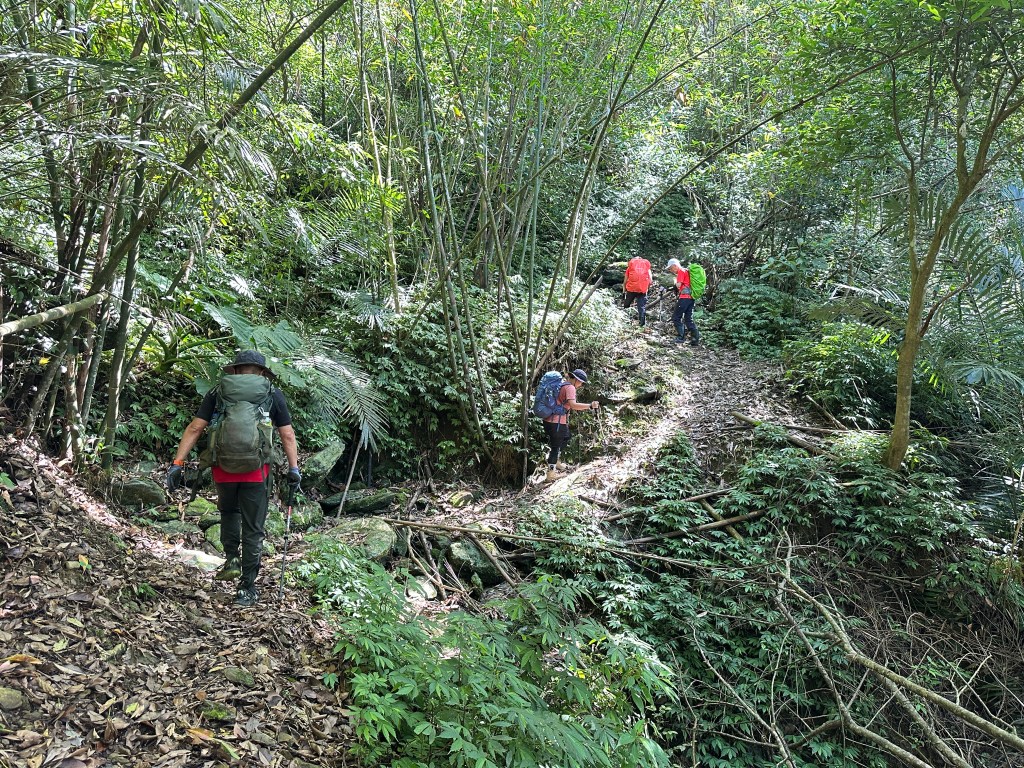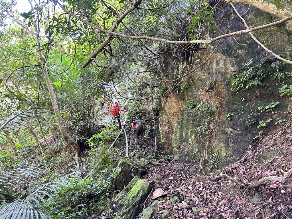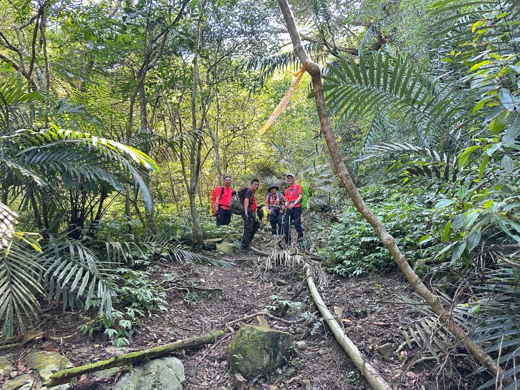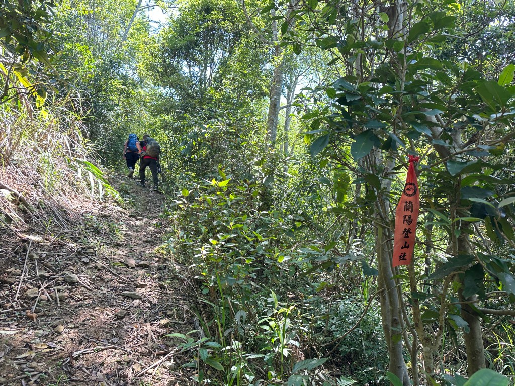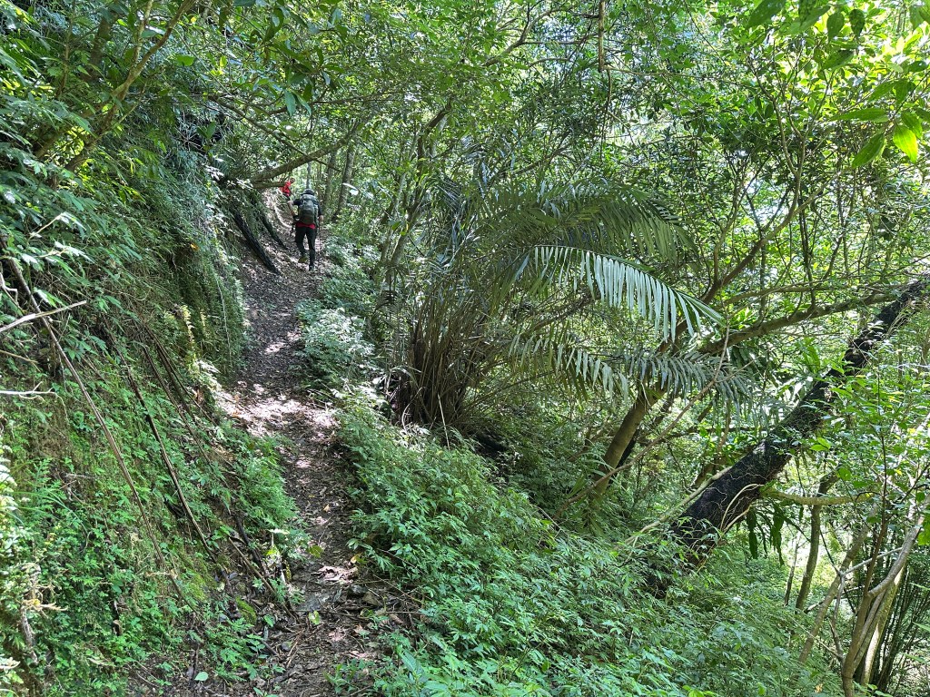 持續前行,由此在寬稜區發現有兩條路徑?右岔走稜線有看到幾條布條,且布條比較新!左岔走腰繞路看不到布條,但有路跡!Allen走在前走得比較快,已經在前方往左側腰繞路一路砍整,Smile與我走得比較慢,因一路綁上布條。因Allen、Eva、Michael已經都離我們快有100公尺,那就繼續走腰繞這一條路線吧!