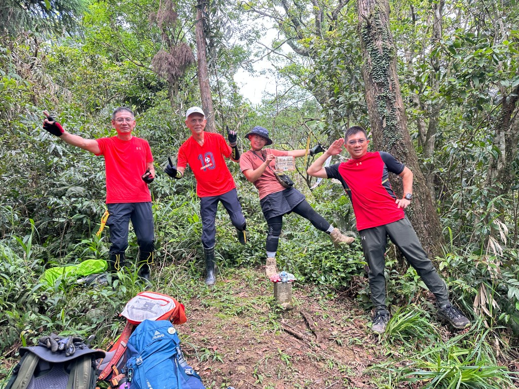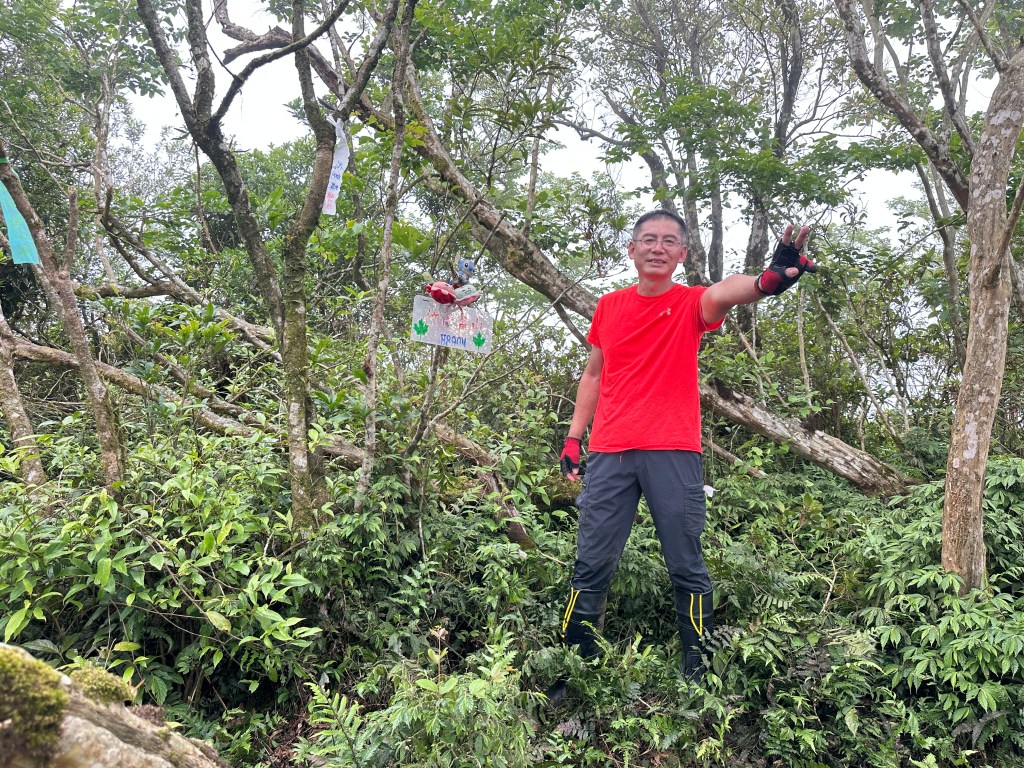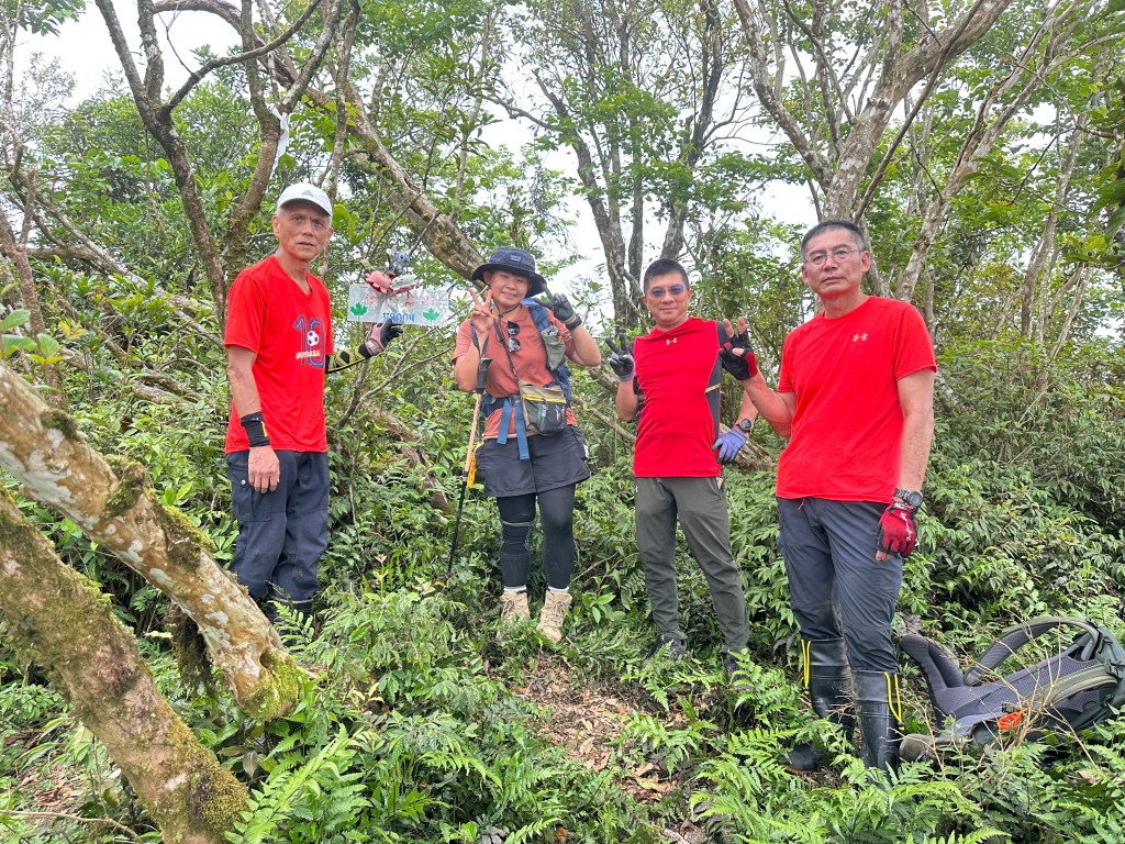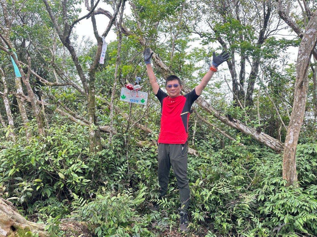 接上來一路陡上的路徑,發現有一些以前登山隊走過的布條,我們決定繼續前行!但接下來的路徑,藤蔓、黃藤、箭竹林不斷,高聳的芒萁、雜草再加上稀少的布條,大伙都一路在找尋路徑,Allen今天超辛苦!一路在前方砍除路徑障礙才能讓我們方便跟著前進,陡上到H720m左右的寬稜上,右側高處才是離線地圖APP所標示的「五峰旗山」!但這個H721m的五峰旗山滿山頭雜草叢生難以親近啊?