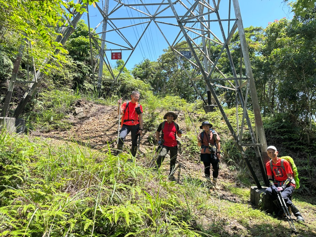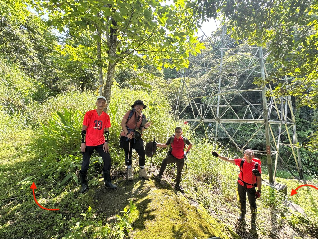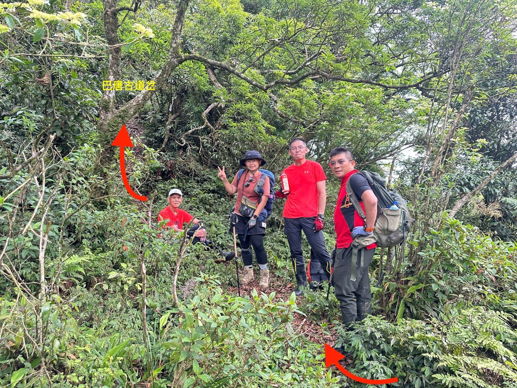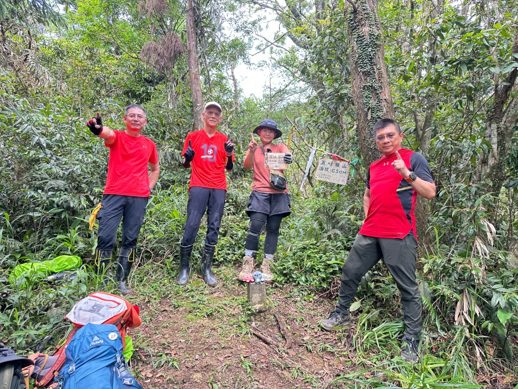 接上來一路陡上的路徑,發現有一些以前登山隊走過的布條,我們決定繼續前行!但接下來的路徑,藤蔓、黃藤、箭竹林不斷,高聳的芒萁、雜草再加上稀少的布條,大伙都一路在找尋路徑,Allen今天超辛苦!一路在前方砍除路徑障礙才能讓我們方便跟著前進,陡上到H720m左右的寬稜上,右側高處才是離線地圖APP所標示的「五峰旗山」!但這個H721m的五峰旗山滿山頭雜草叢生難以親近啊?