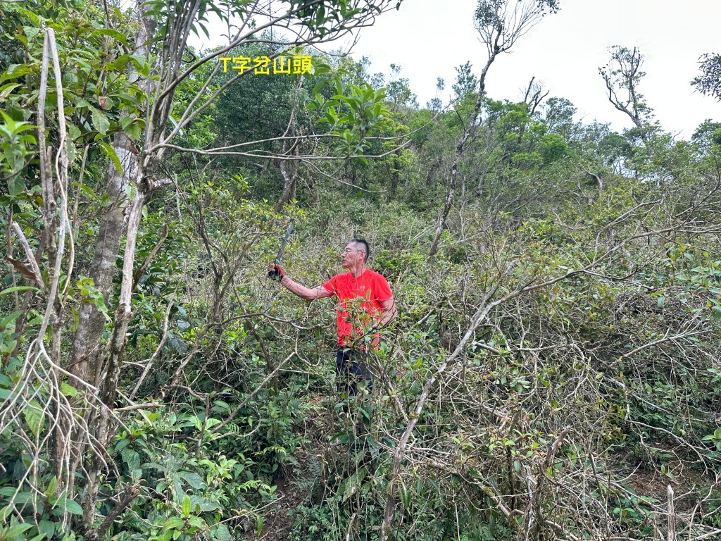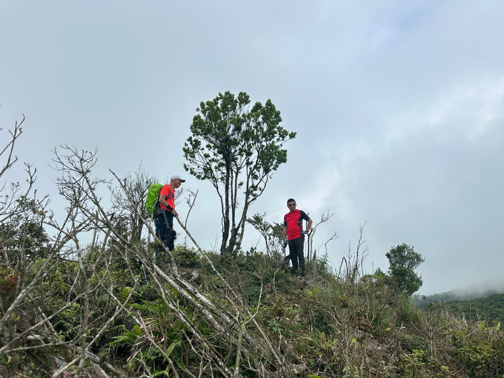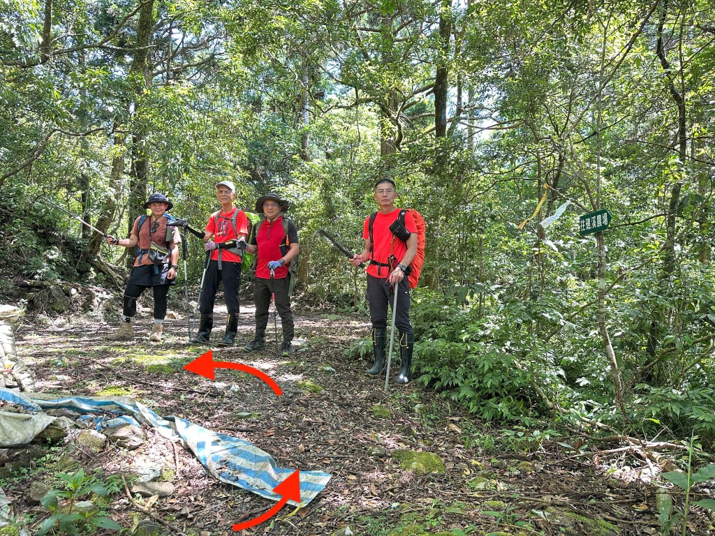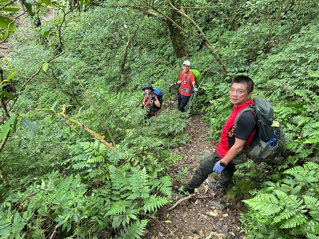 運氣不錯!接下來的路徑雖然也有一段長滿植披的隱藏版邊坡斷崖,但越接近T字岔路徑越好走,在T字岔山頭下方,我們四人都放下了背包,也都各自吃一些行動糧,因為已經錯過午餐休息的時間。由此山頭下方看到左前方的山頭,對!就是直接陡上就是!我們五人,每人都各走了自己認為好走的路徑陡上!