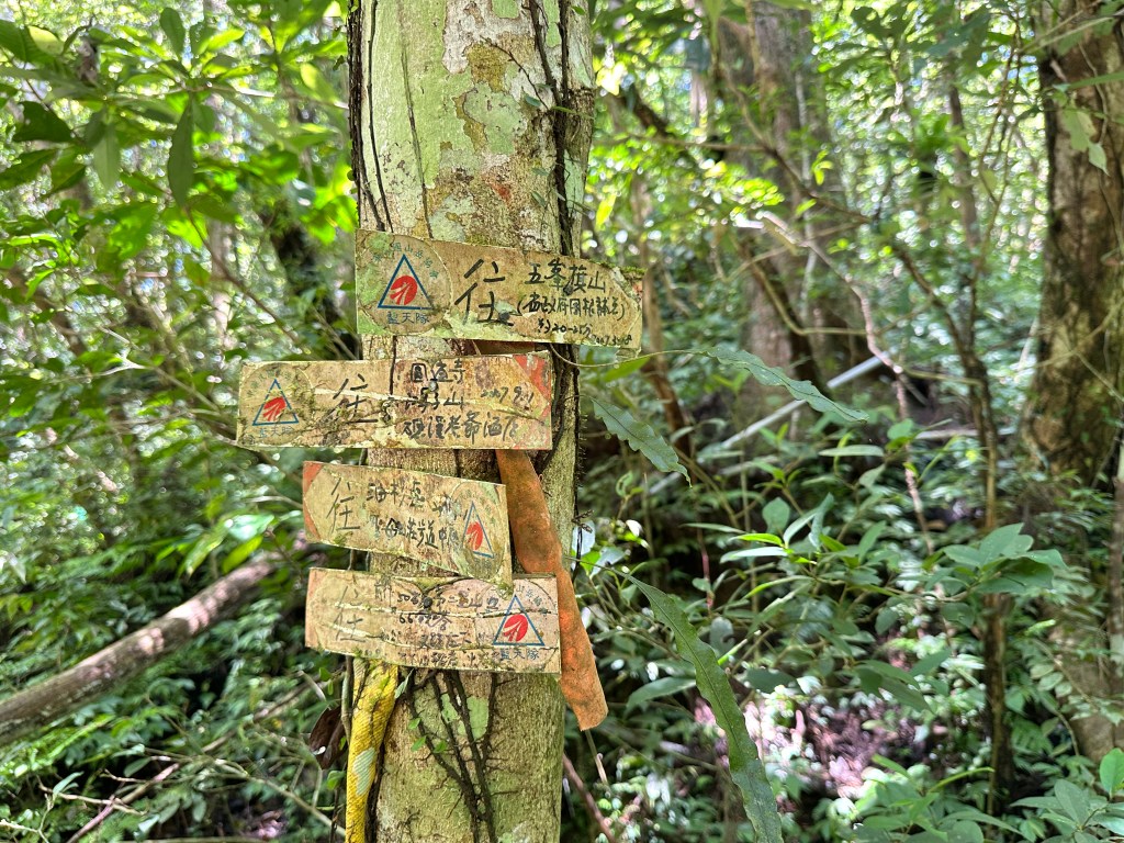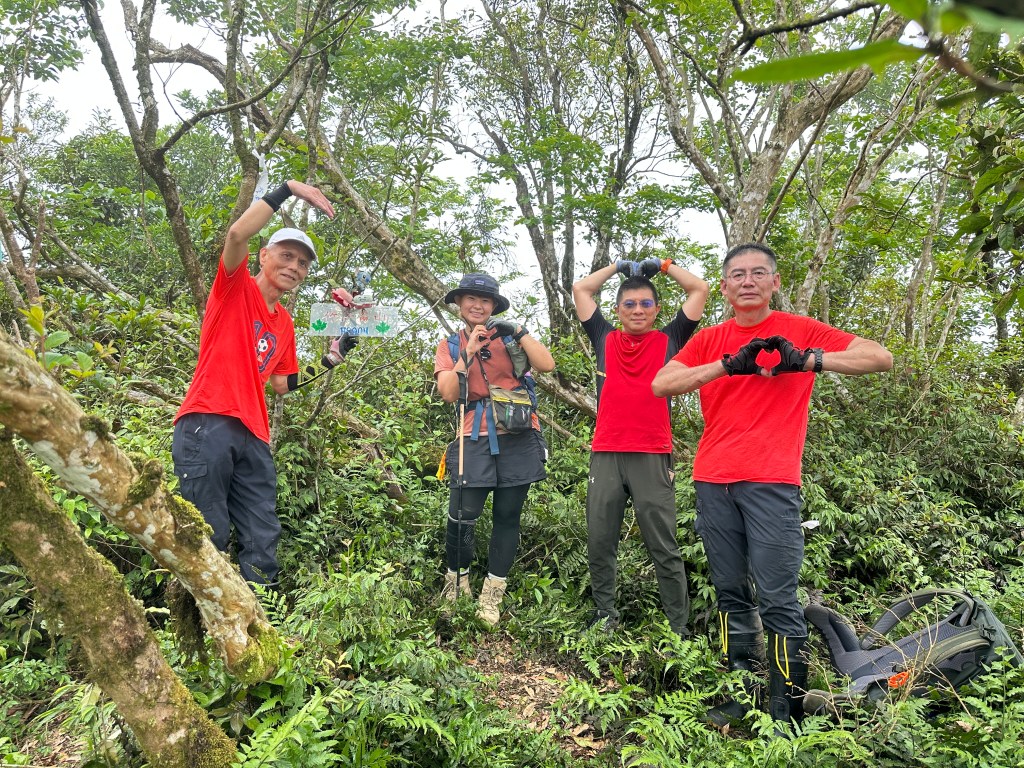 我們在五峰旗山三角點這裡休息,原想要準備來吃午餐了!但想想,如果想繼續往竹仔崙山走,感覺上接下來的路徑條件應該不明?大伙五人就重拾背包,在三角點這裡往前繼續直走!