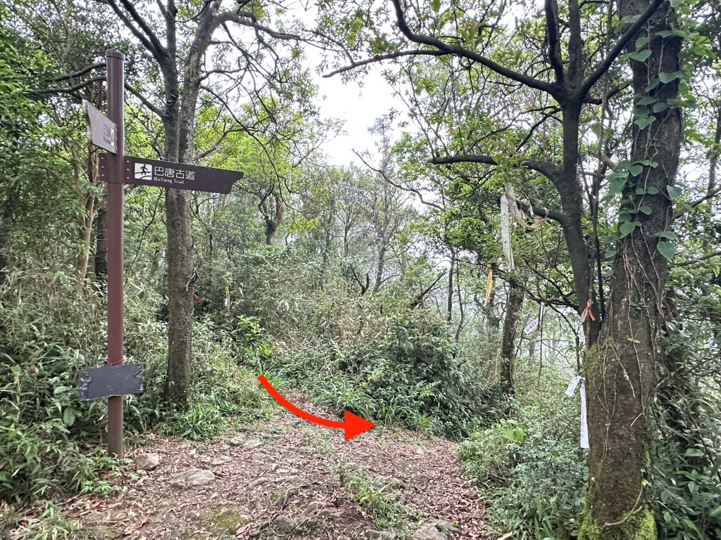 續往竹仔崙山方向走,接續的400公尺就是瘦稜但是那種安全的瘦稜路徑,其中還看到了一隻山羌的完整骨骸!離開竹仔崙山,繼續往前走300m,中途左邊可以看到往北五峰旗山的岔路,接上巴唐古道後,左轉沿著巴唐古道而下,沒想到這其中一段800公尺陡下的巴唐古道,如此好走?至少跟今天整天走過的路徑比起來啦!