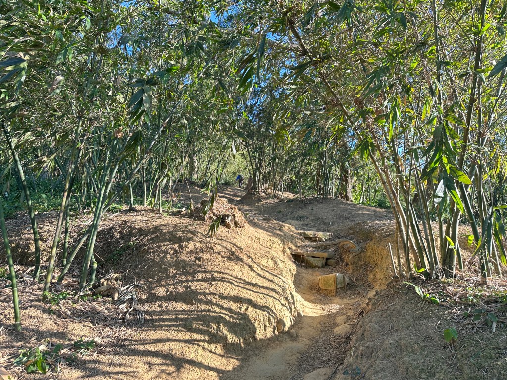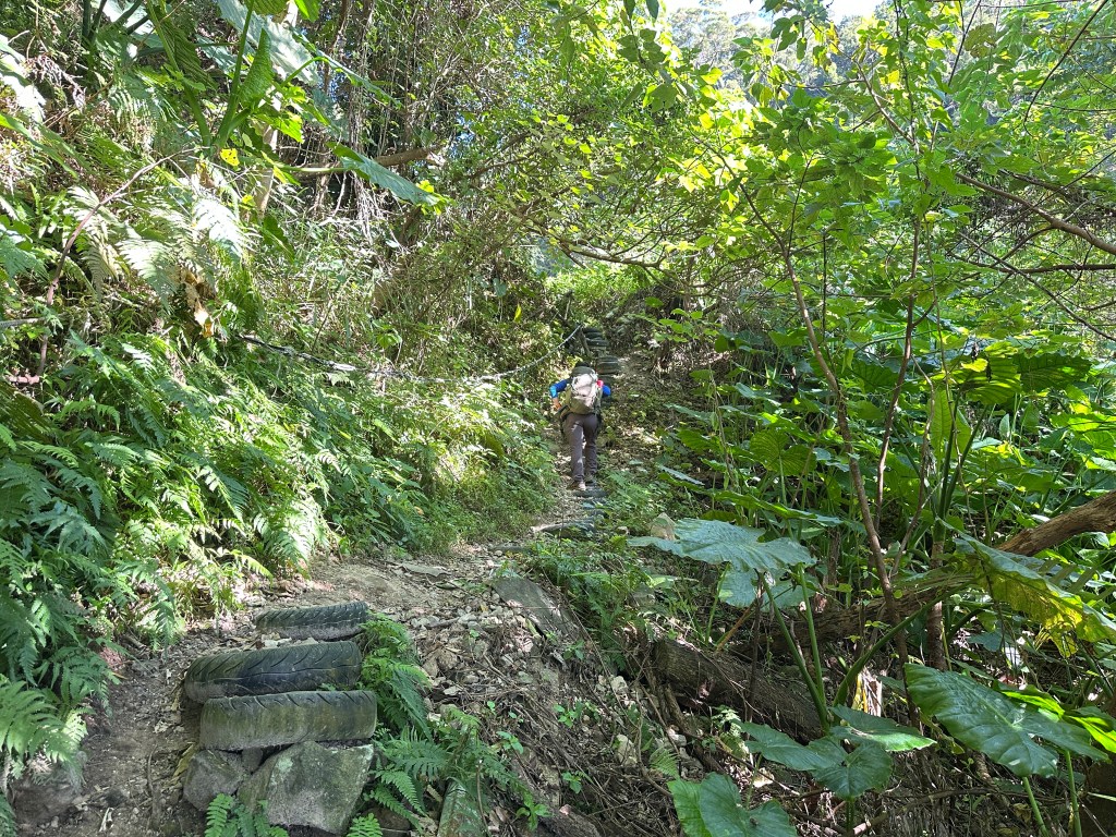 過了凌雲尖後的山徑都好走,沿著尖山步道支線中途右岔而出,再往前遇岔路有指標顯示往右岔陡下到駱駝峰,過駱駝峰後繼續陡下到接上北橫2路的T字岔,由此岔路左轉繼續沿著北橫2路走,前行後再遇到岔路,北橫2路在此會右轉,但在此岔路我們仍然繼續陡上前行,這一段山友們稱為101步道!一路陡上就會陡上到觀音山硬漢嶺。