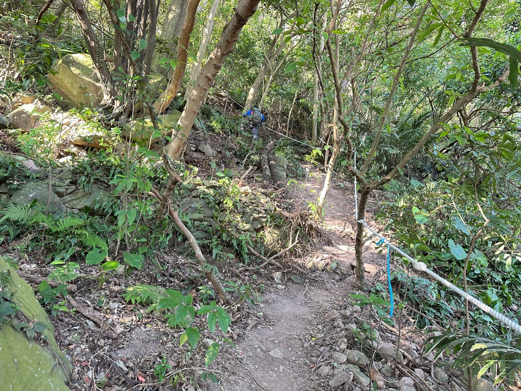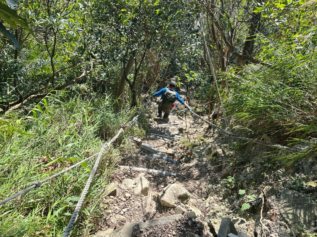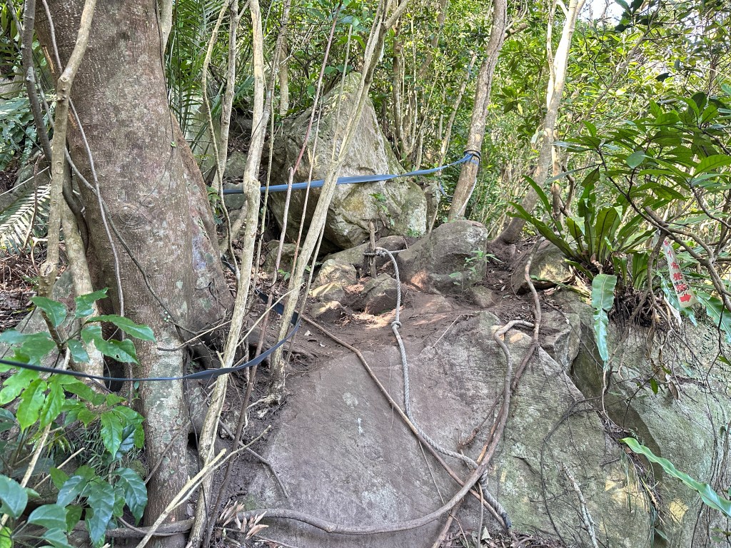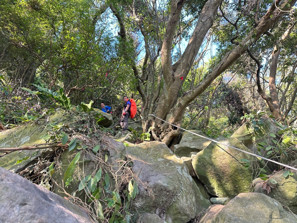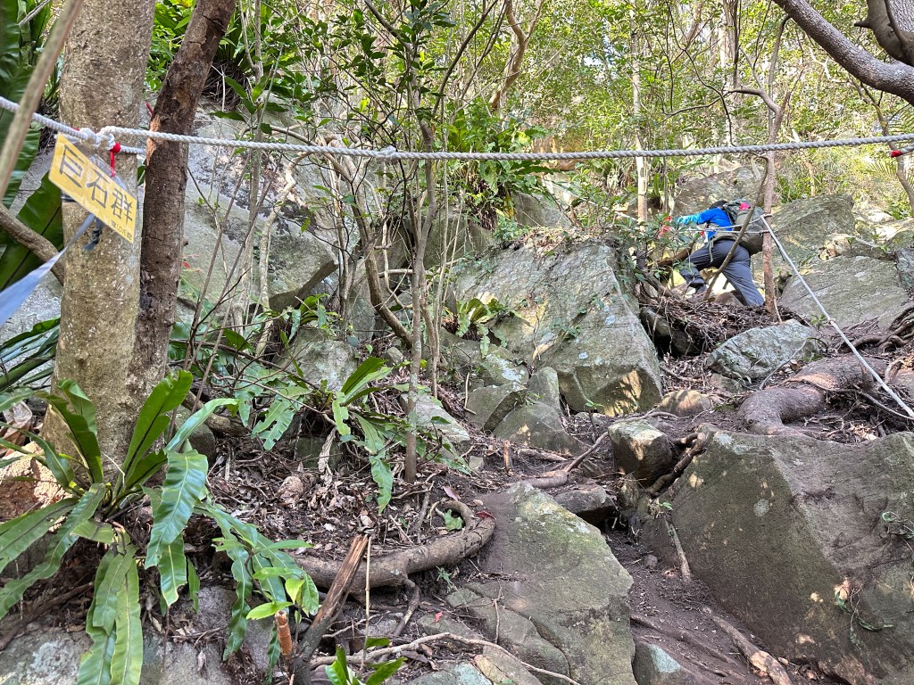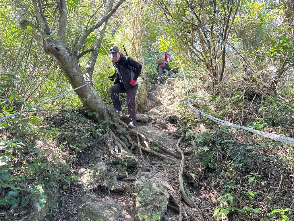 整個過程地形比較特殊的段落有幾處。就是過了潮音2尖後,由石階步道右轉進入山徑開始往盤絲1尖方向走,這一段是陡上走在較崎嶇的岩石路上。另外,過了盤絲2尖後到凌雲尖之間是有名的大岩壁,需要垂直拉繩陡上有20米的高度!