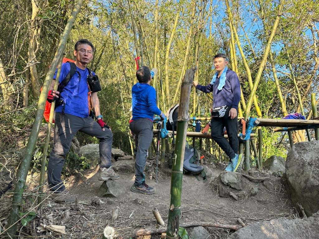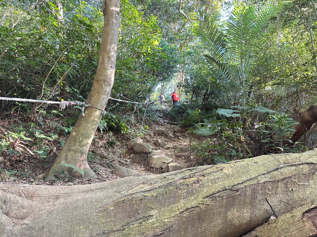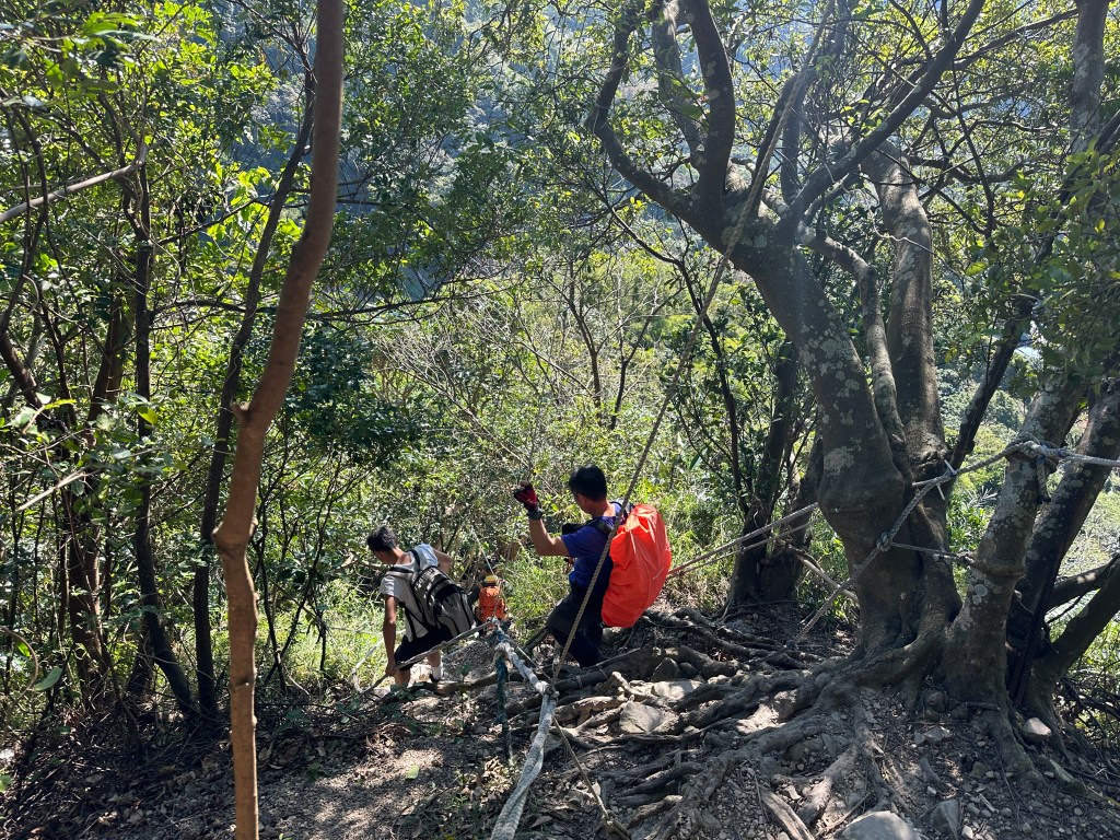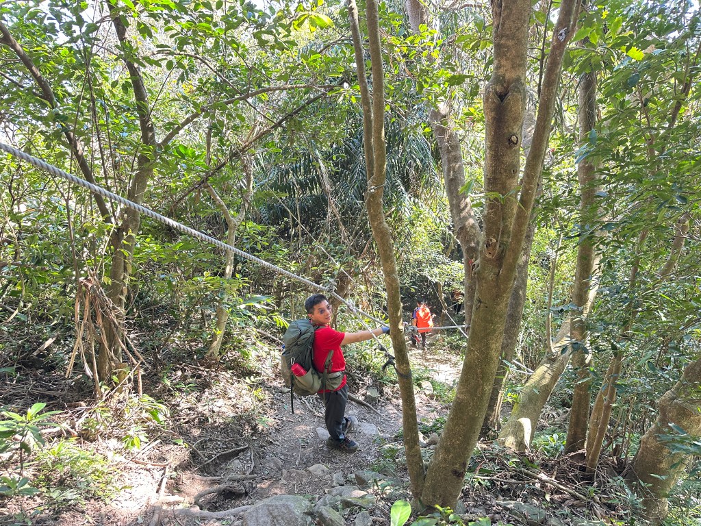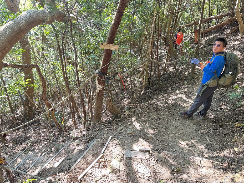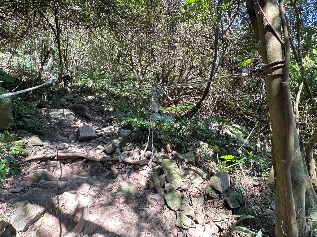 整個過程地形比較特殊的段落有幾處。就是過了潮音2尖後,由石階步道右轉進入山徑開始往盤絲1尖方向走,這一段是陡上走在較崎嶇的岩石路上。另外,過了盤絲2尖後到凌雲尖之間是有名的大岩壁,需要垂直拉繩陡上有20米的高度!