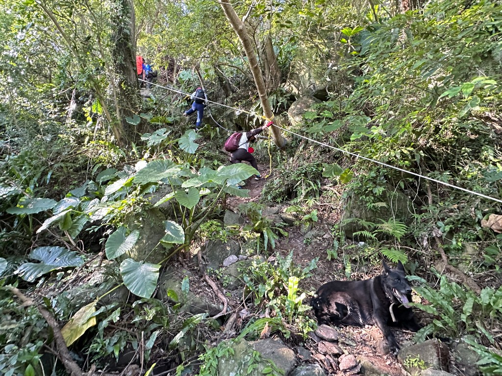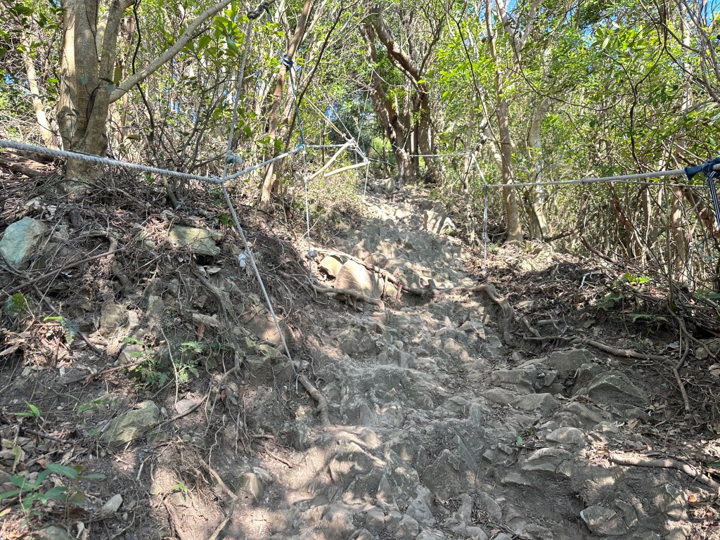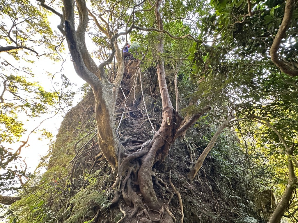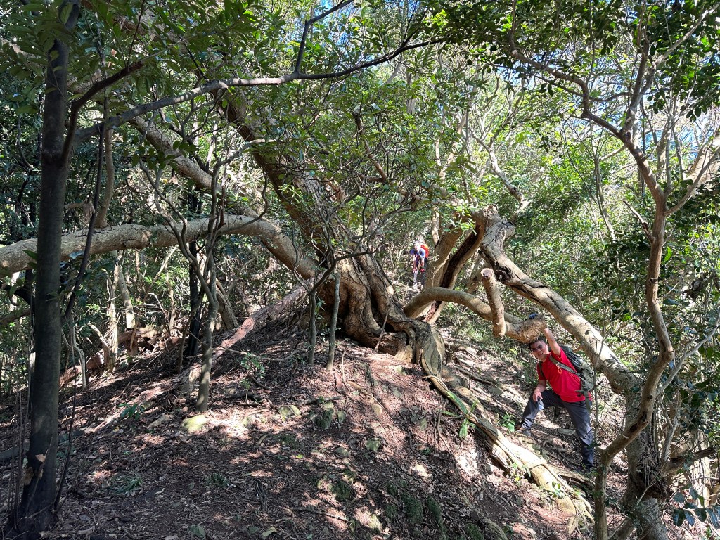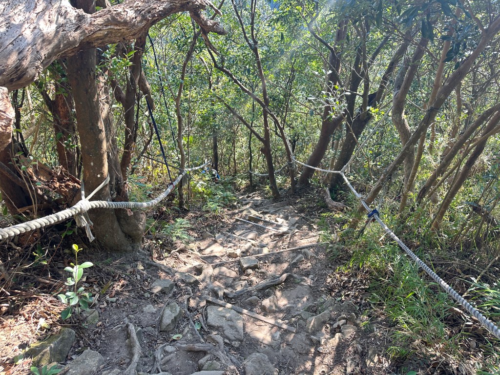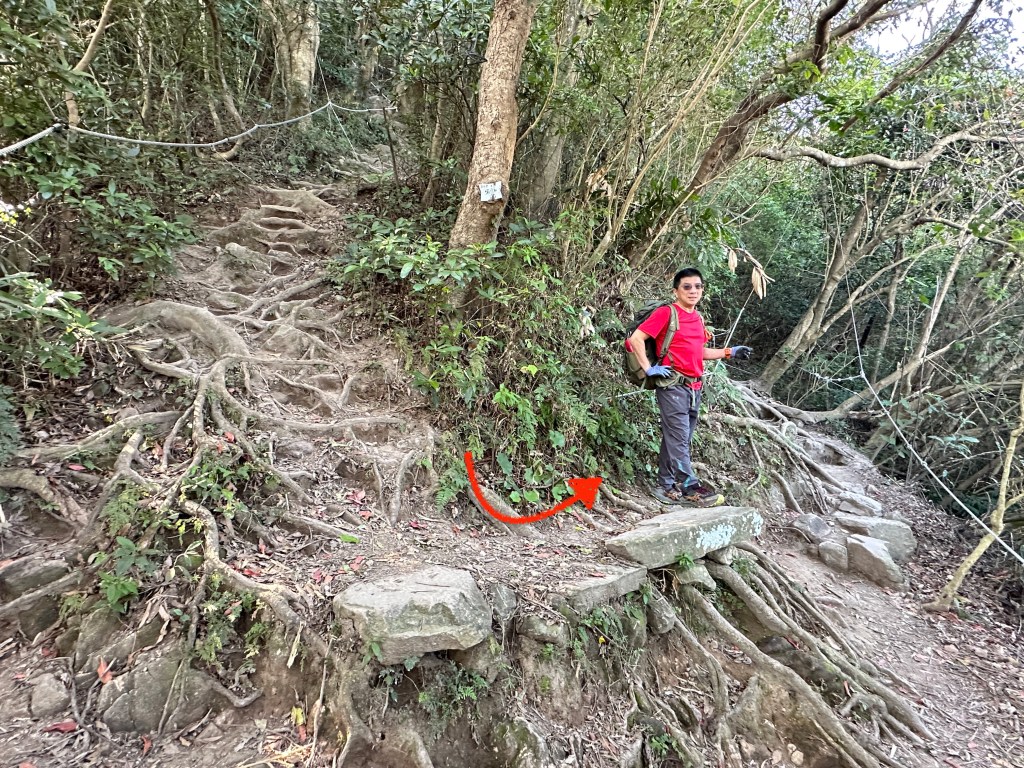 整個過程地形比較特殊的段落有幾處。就是過了潮音2尖後,由石階步道右轉進入山徑開始往盤絲1尖方向走,這一段是陡上走在較崎嶇的岩石路上。另外,過了盤絲2尖後到凌雲尖之間是有名的大岩壁,需要垂直拉繩陡上有20米的高度!