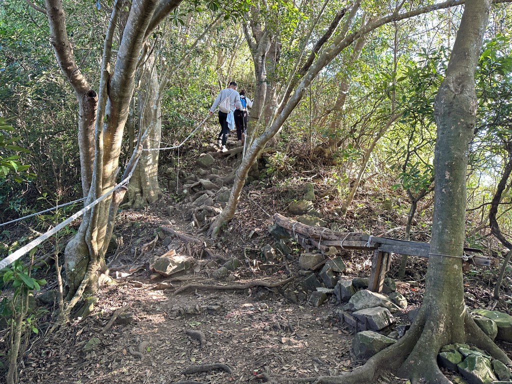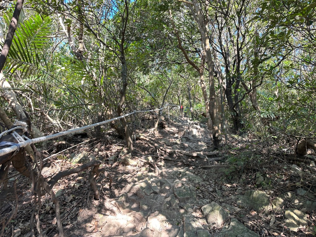 緊接著,回到尖山步道涼亭,沿著石階梯原路陡下,繼續沿著尖山步道走,由海拔H320m一路陡梯上到H417m的潮音1尖,再來一個深V地形就來到H412m的潮音2尖。