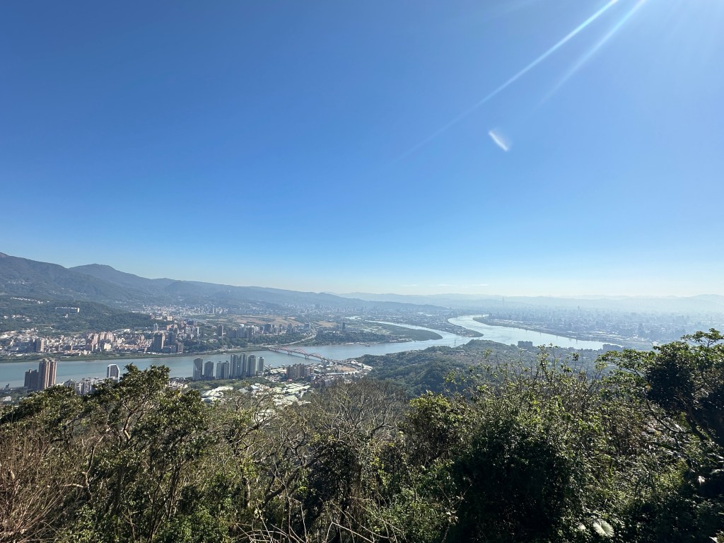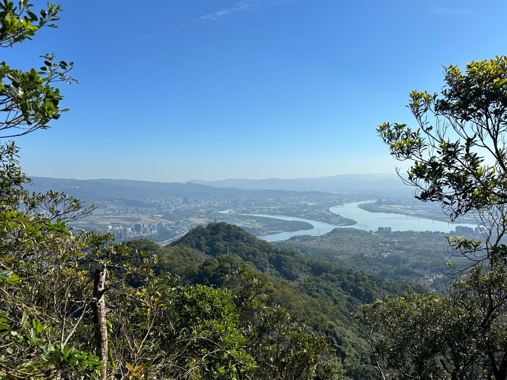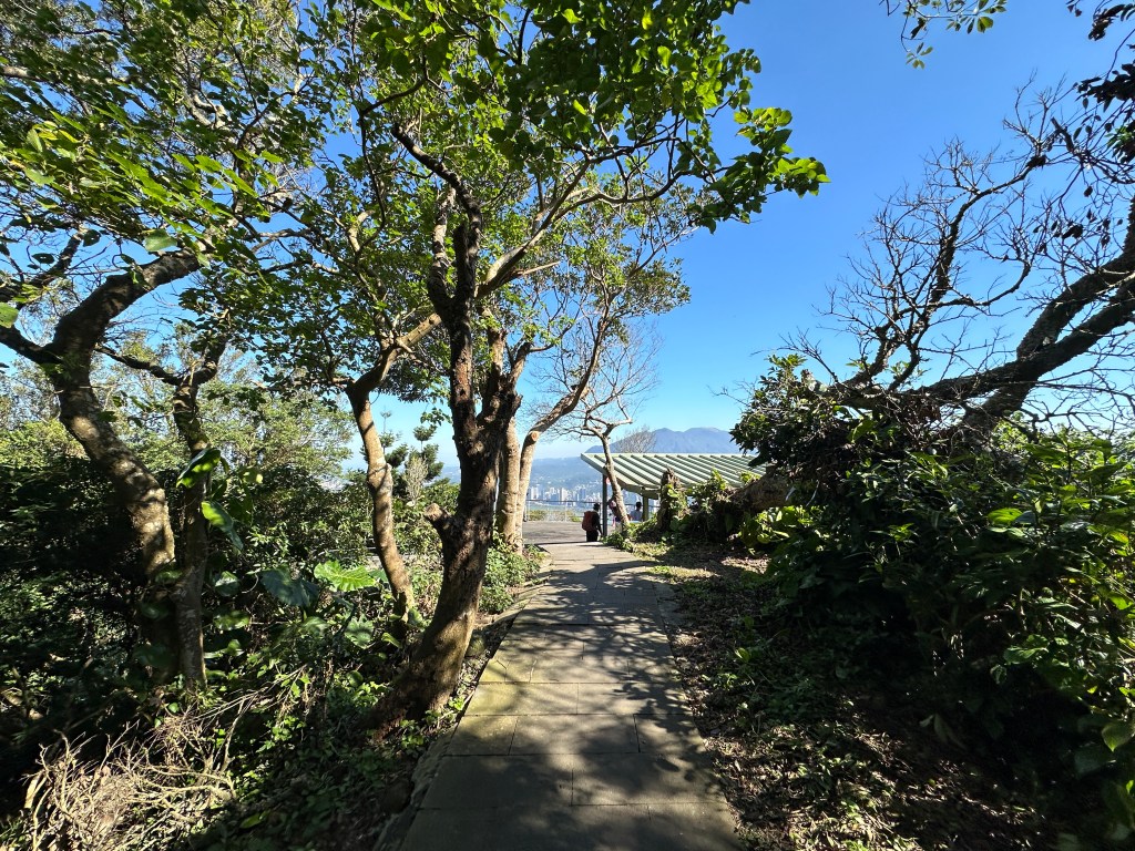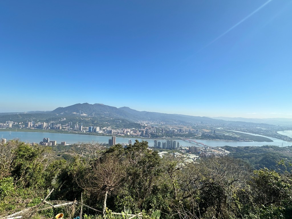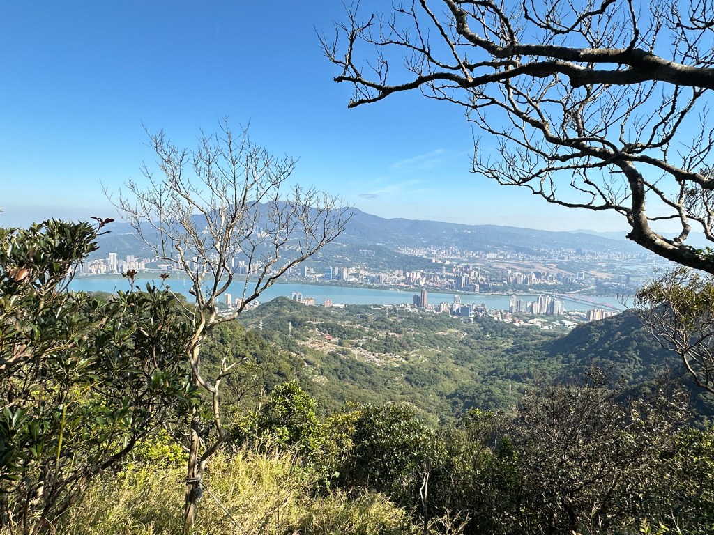 在尖山步道這裡右轉沿著尖山步道走300公尺可抵達尖山也就是占山,這300公尺的前200公尺步道平緩,最後100公尺就要直接陡上石階梯到涼亭,實際上尖山的三角點在涼亭邊!由涼亭往左前走30公尺就是尖山觀景台,這裡的展望絕佳,可以看到大台北地區以及淡水河出海口這一段的風光。